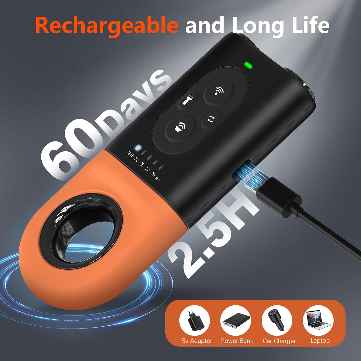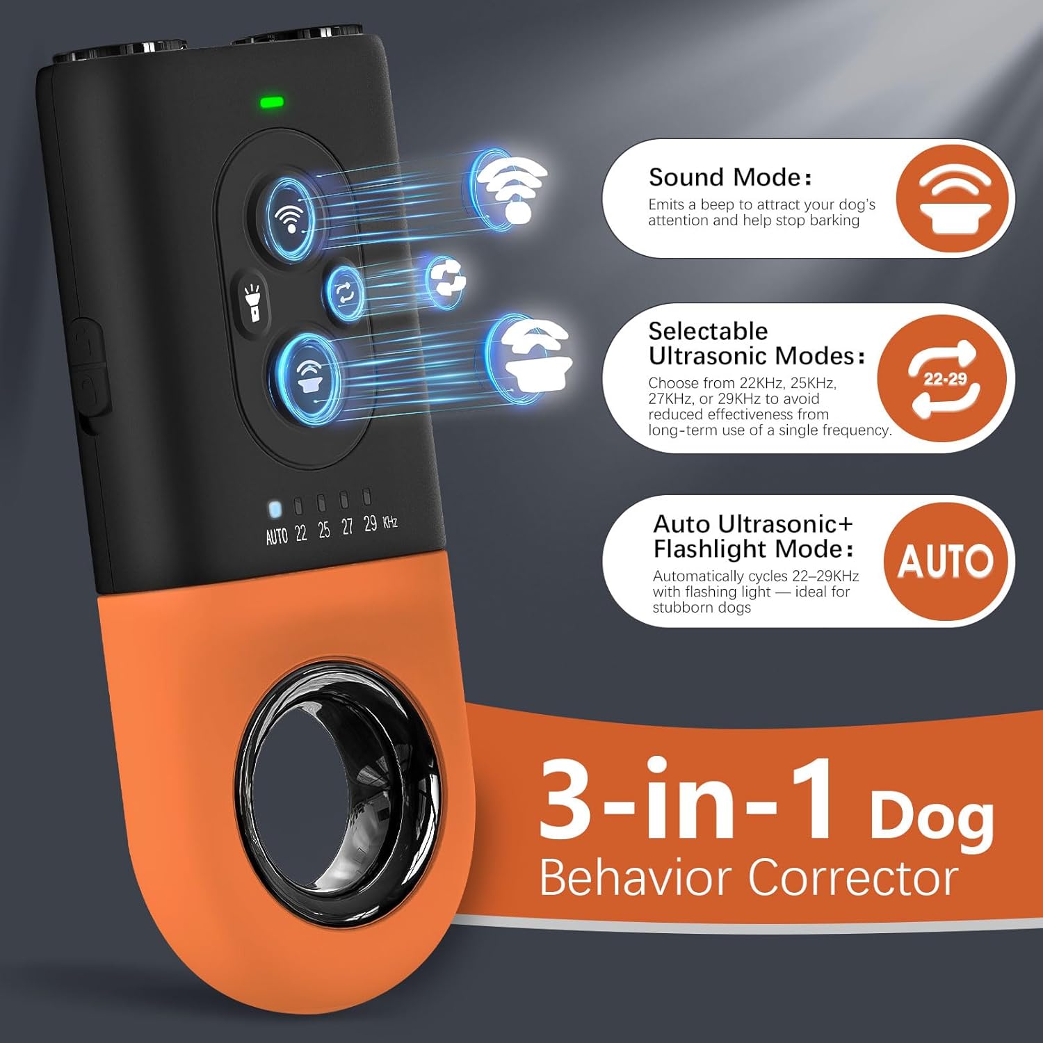 Auto Ultrasonic + Strobe: Dog Bark Deterrent Device cycles 22–29 kHz while a flashing light reinforces the cue, interrupting barking. Effective for resistant dogs and noisy settings. Use brief bursts, train humanely, keep light from eyes.