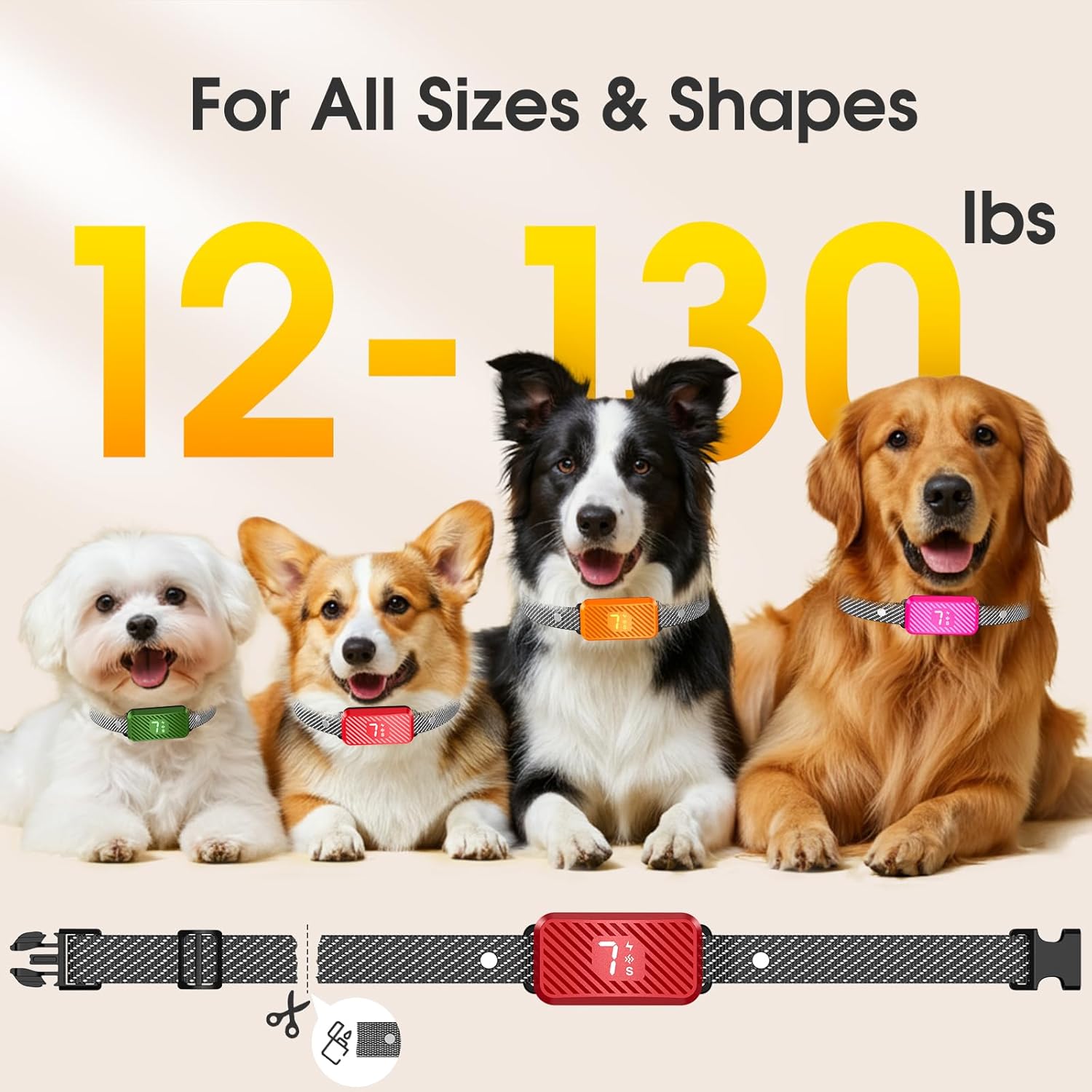 ③ 3+7 CUSTOMIZABLE TRAINING MODES. Every dog is unique, and so are their training needs. That’s why we designed our no bark collar with fully customizable training: 3 correction modes (beep+vibration and other combinations) and 7 sensitivity levels. Perfect for apartment living, backyard play, or late-night quiet hours – tailor the settings of this stop barking collar to match your dog’s temperament and your lifestyle. It’s like having a professional dog trainer on call, 24/7!