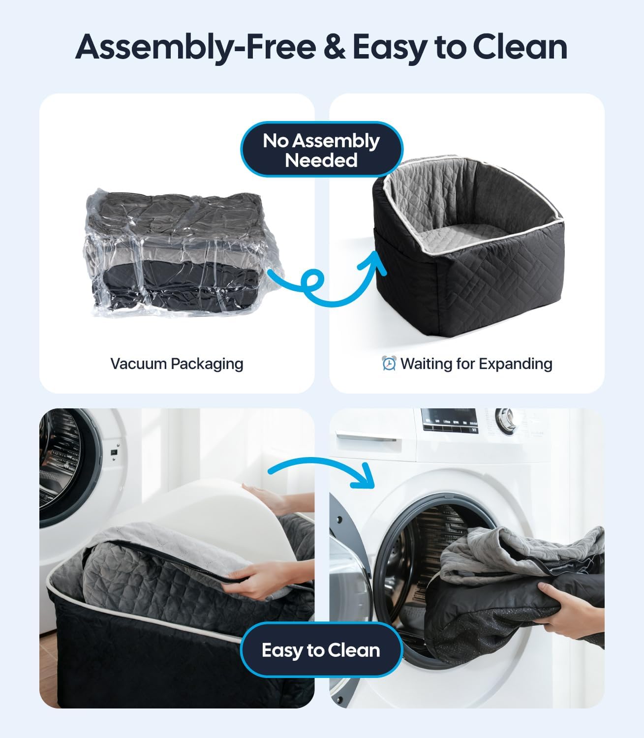 【All-Weather Use, Easy Cleaning】 Built with durable, waterproof, and wear-resistant fabric that stands up to sand, mud, and pet hair. Quick-dry surface wipes clean in seconds, while the removable cover is fully machine washable. Perfect for car trips, cozy naps at home, or outdoor camping adventures—one seat for every setting.