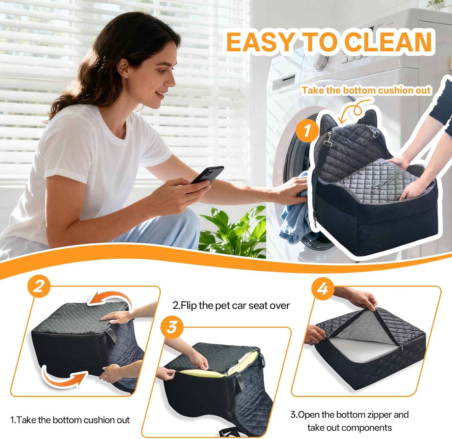 【Effortless Cleaning & Simple Removal】The entire outer cover of this dog car seat is designed for your convenience, featuring an easy-access zipper at the base for quick removal. Simply unzip and machine wash the cover to eliminate dirt, odors, and messes, ensuring a clean environment for every trip. NOTE: The internal foam is not machine washable and should be spot cleaned only