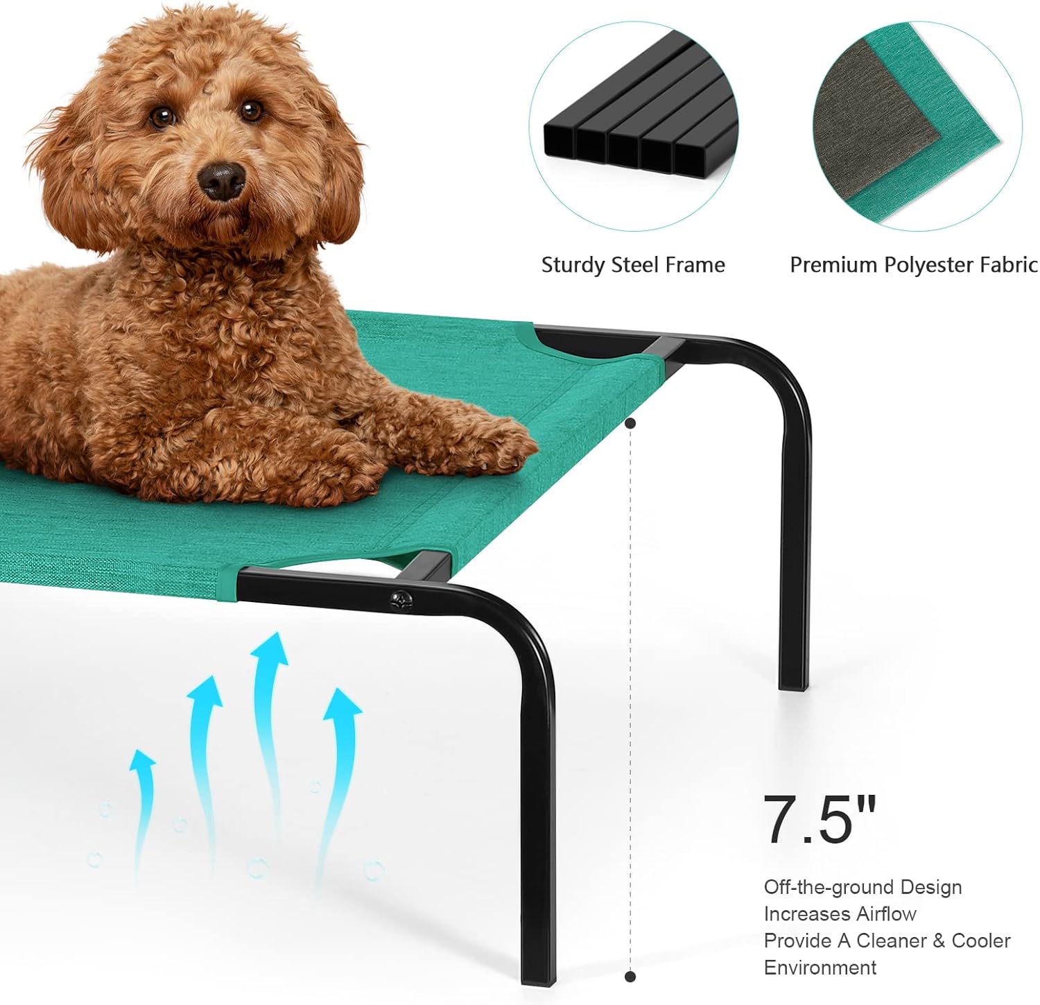 【Elevated Dog Cat Bed】:Our portable small dog bed is specially designed with 7.5” elevated from the ground, Which would highly increase airflow around the dog cot and provides a cleaner, dryer, cooler, and more comfortable environment for your pets, especially in the hot summer.