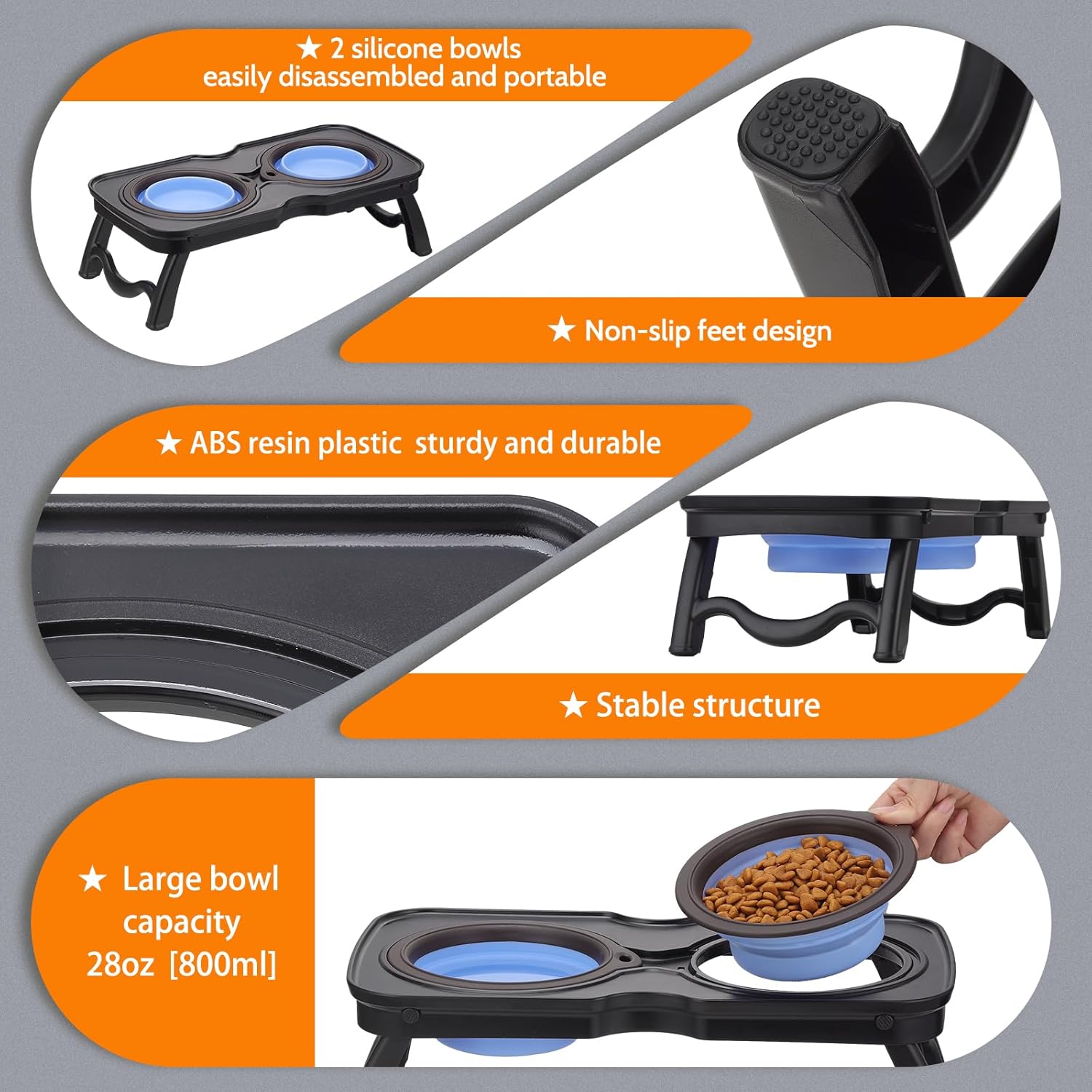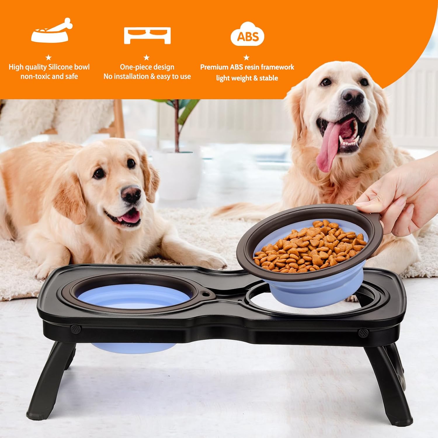 【Premium material & safe for health】The elevate ddouble bowl feeding table is made of ABS resin frame and high quality food-grade silicone bowls, non-toxic and safe for pet health.
