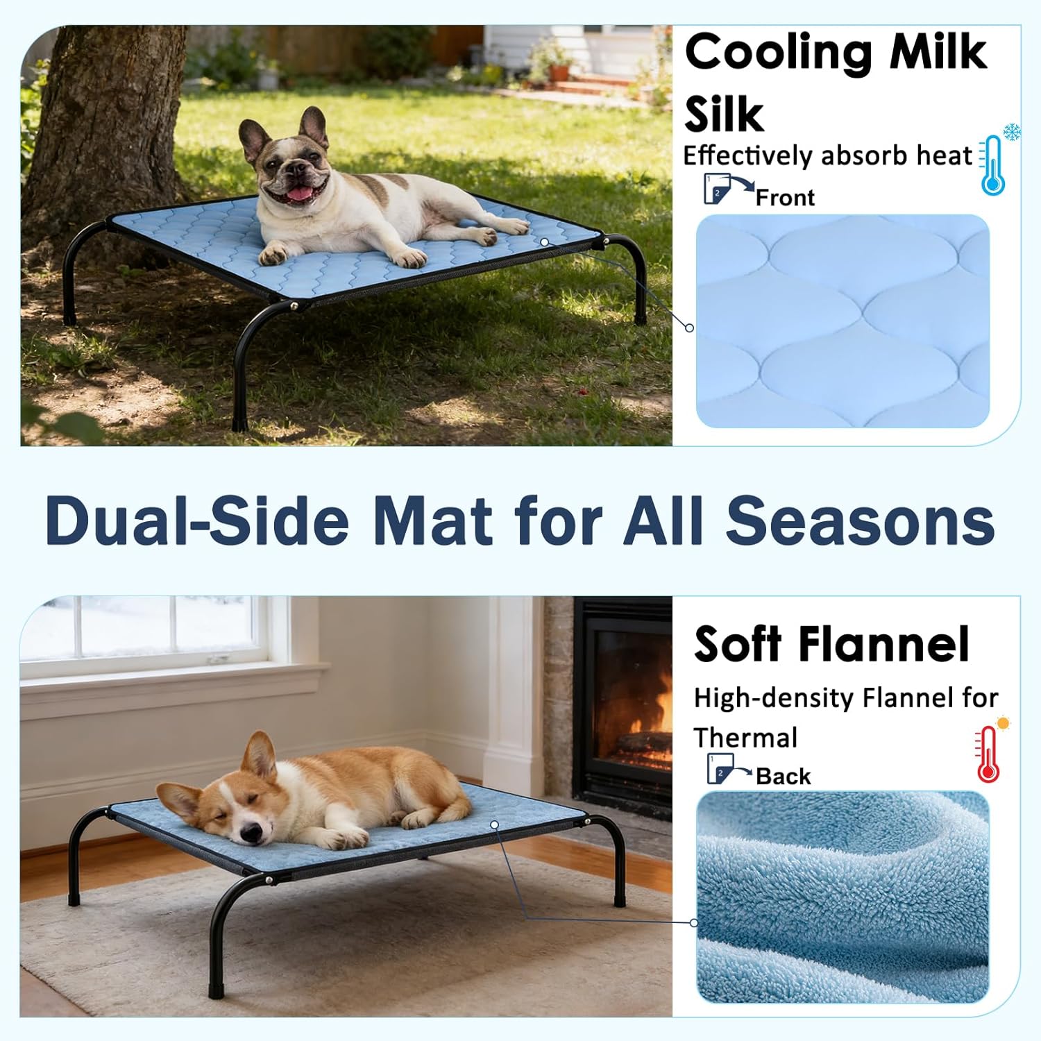 Dual-Side Mat for All Season Use – Designed with a dual-sided surface—premium cooling silk for summer heat dissipation and high-density flannel for winter warmth, this mat also features a breathable cotton layer for softness and airflow, plus a hidden TPU waterproof membrane to protect against spills and accidents.