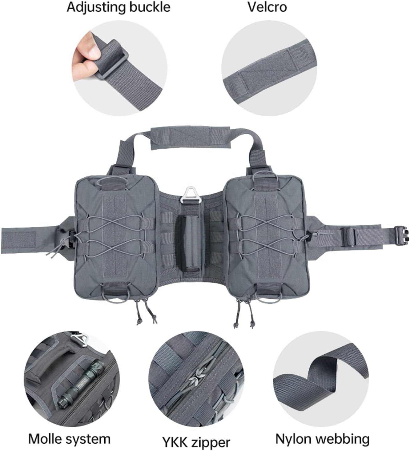 This dog military backpack has quick release buckle & cushion magic sticker on the belly strap for better fixation, can reduce friction on the body and providing more sense of security and better experience of playing fun.