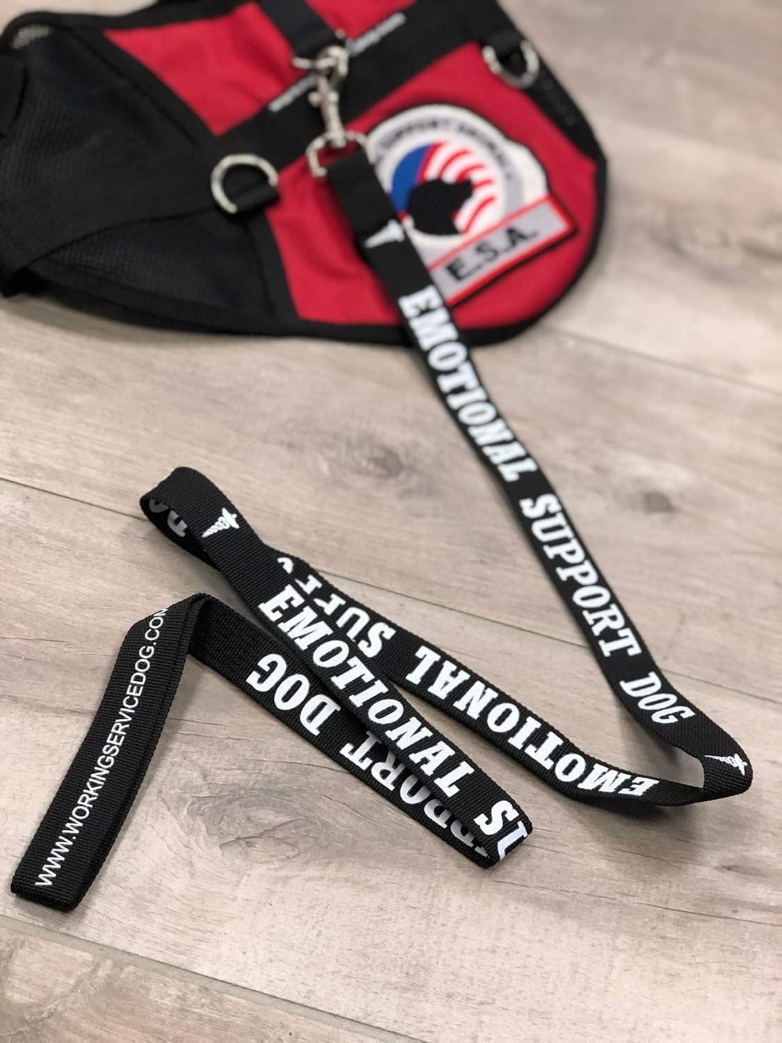 1 inch wide, 4 foot long EMOTIONAL SUPPORT DOG imprinted leash. Black with white writing on both sides of the leash.Features the words EMOTIONAL SUPPORT DOG written boldly on the leash with the Caduceus medical symbol. Lightweight and perfect for small or large dogs.