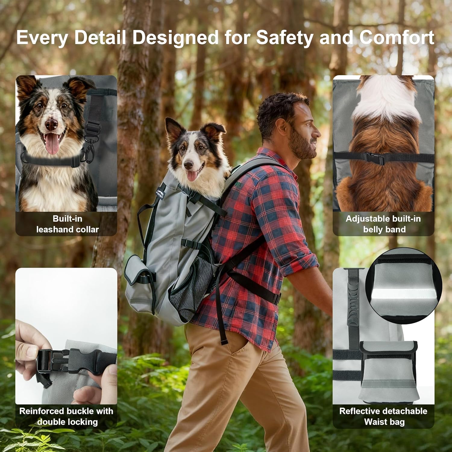 Comfortable for the owner: This dog backpack carrier is designed with padded shoulder straps and adjustable chest and waist loops for perfect weight distribution and reduced back strain. Its ergonomic design ensures comfort even on long walks or outdoor excursions, while the breathable mesh back keeps you cool even on hot days. Enjoy your adventures with your pet without the burden!