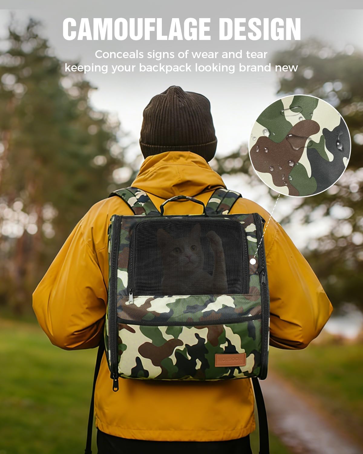 CAMOUFLAGE DESIGN HIDES WEAR: The unique camo pattern helps conceal scratches, dirt, and daily wear, keeping your dog carrier backpacks looking clean and fresh even with frequent travel. A stylish and practical choice for city commuters, multi-pet families, and outdoor users