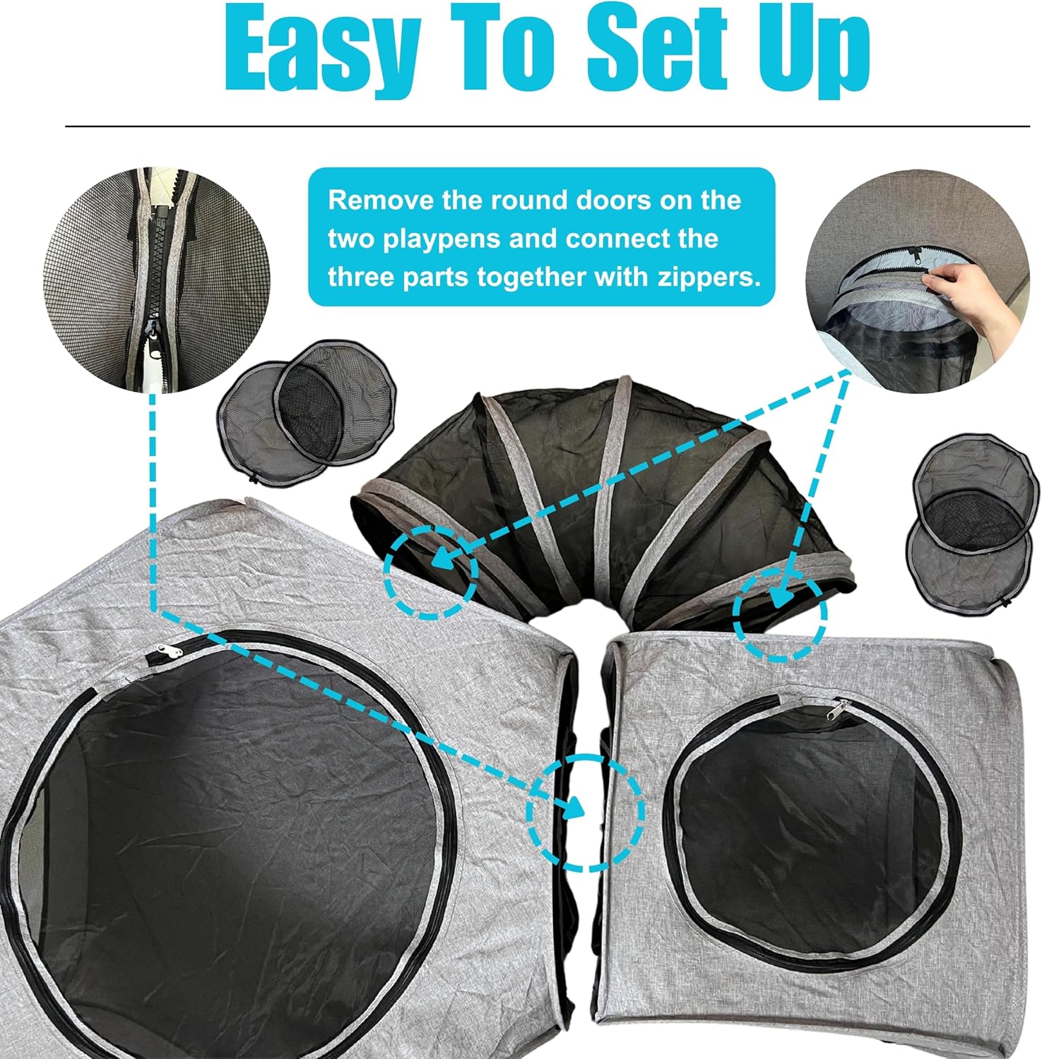 【Spacious & Comfortable】– With dimensions of 46″L x 33″W x 18″H, this playpen provides ample space for 1-3 cats or 1-2 puppies to rest, play, and bask in the sun. It includes a 33″ diameter hexagon playpen, a 18″ quadrilateral playpen, and an U-shaped tunnel. Each playpen features detachable circular zipper doors for easy configuration and access.