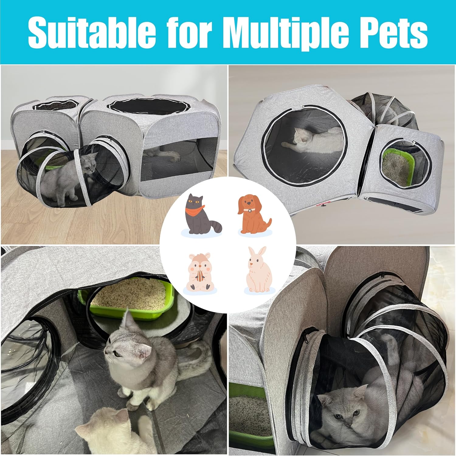 【Spacious & Comfortable】– With dimensions of 46″L x 33″W x 18″H, this playpen provides ample space for 1-3 cats or 1-2 puppies to rest, play, and bask in the sun. It includes a 33″ diameter hexagon playpen, a 18″ quadrilateral playpen, and an U-shaped tunnel. Each playpen features detachable circular zipper doors for easy configuration and access.