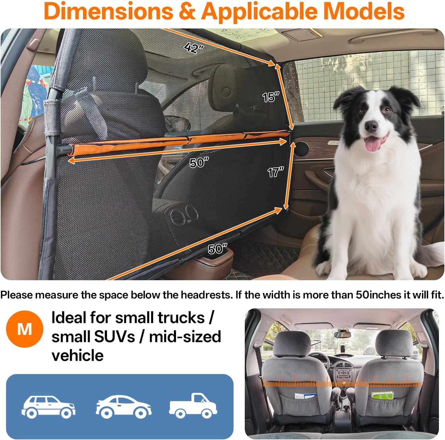 【Perfect Fit for Most SUVs & Small Trucks】–The Dog Car Barrier spans 50” wide (tapering to 42” at the top) and 32” tall, ensuring seamless compatibility with 2nd/3rd row seats and cargo areas of m id-sized vehicles, small trucks, and SUVs. Measure your space to confirm the ideal size (under 56” = Medium Size).