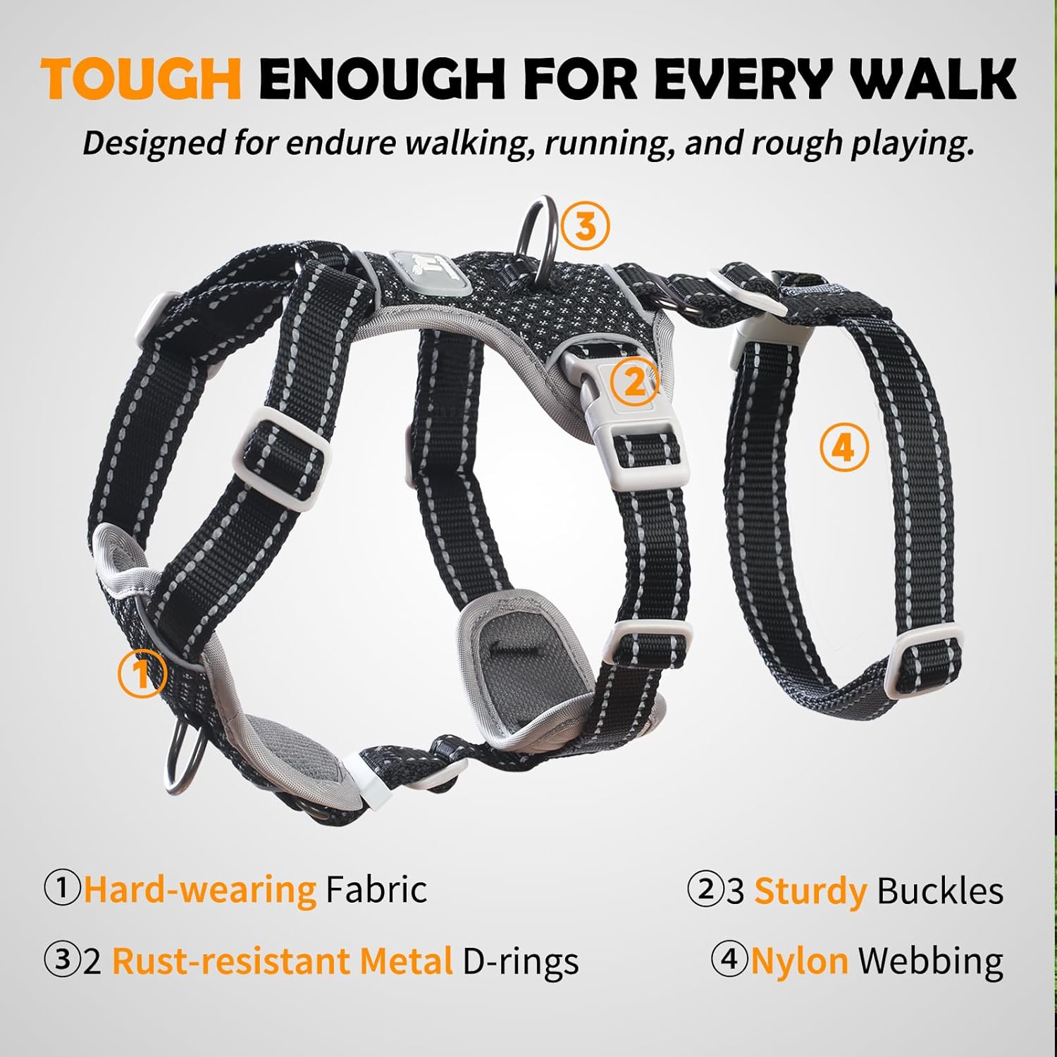 All-Day Comfort and Durability: This anti pull dog harness is made with breathable padded air mesh and soft 4mm sponges, this harness for medium dogs minimizes friction and maximizes comfort. The semi-back coverage ensures breathability, keeping your dog cool during walks, training, or outdoor activities. Crafted from high-density nylon, it’s lightweight yet strong, providing long-lasting durability without bulk, preventing overheating and offering freedom of movement for your dog.