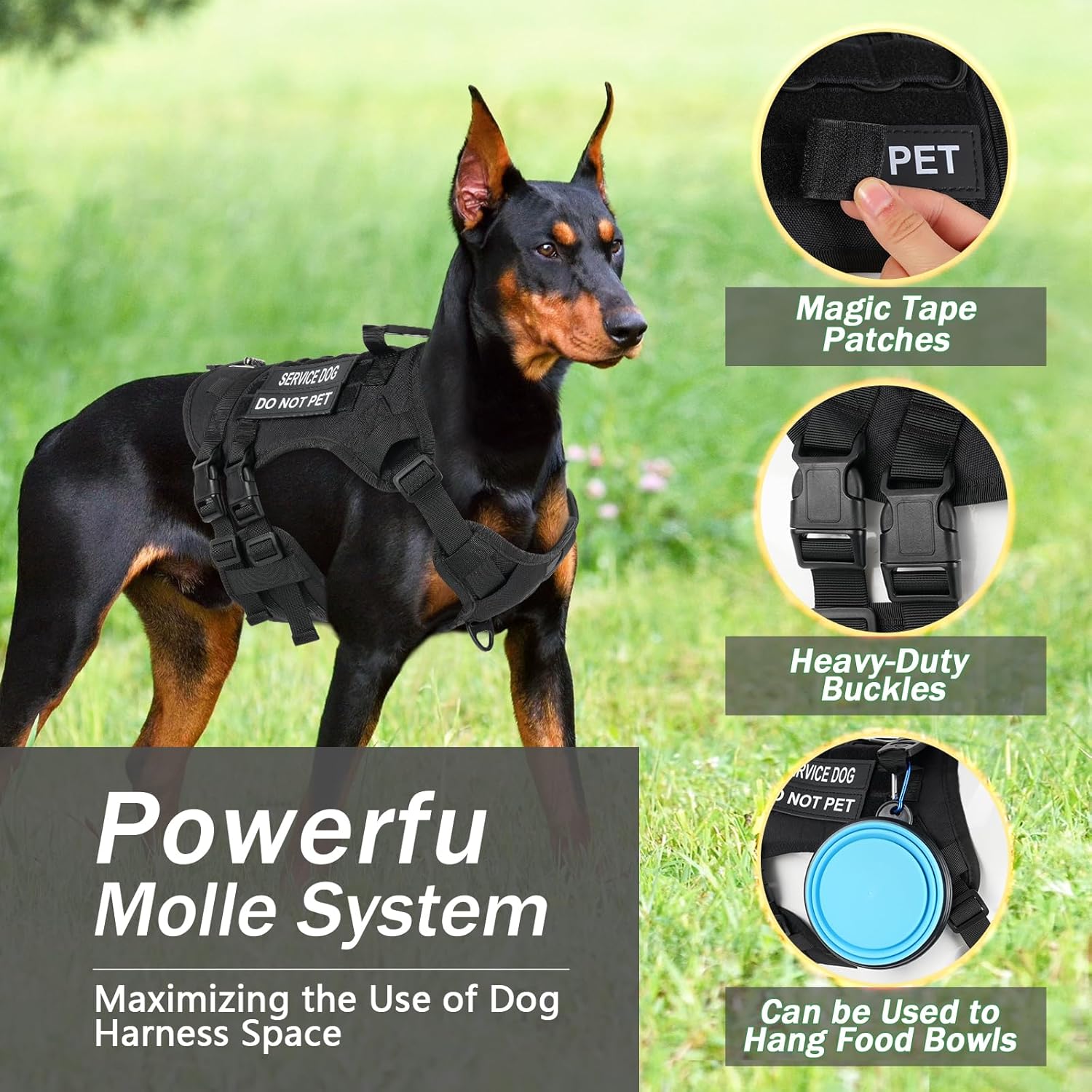 【Featured Accessories】The heavy duty dog harness includes 1 professional dog leash & 1 retractable car seatbelt & 1 storage strap & 2 service dog patches & 2 DO NOT PET Patches. This is perfect for most travel scenarios without the need to purchase other accessories.