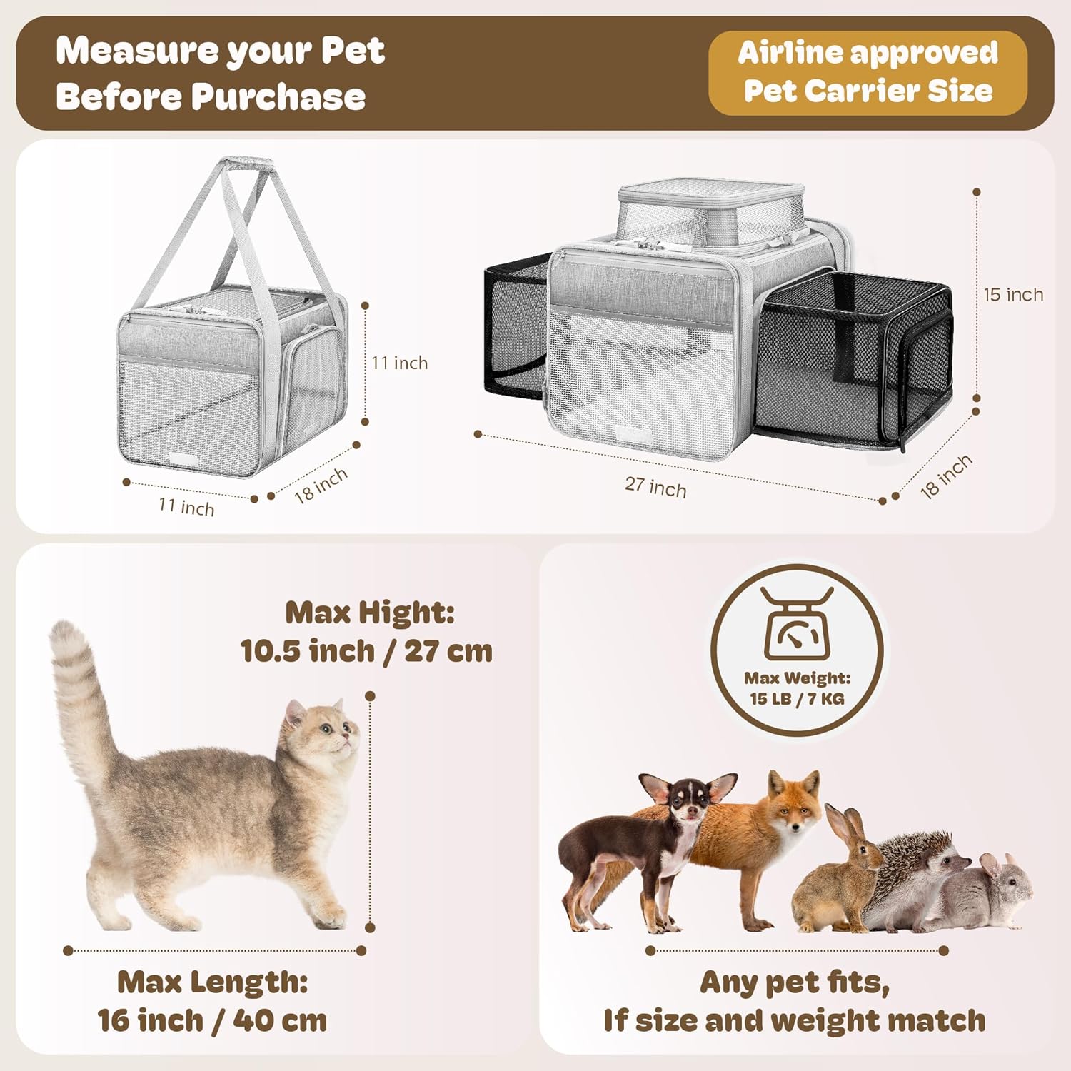 𝗟𝗔𝗥𝗚𝗘𝗦𝗧 𝗘𝗫𝗣𝗔𝗡𝗗𝗔𝗕𝗟𝗘 𝗦𝗣𝗔𝗖𝗘 𝗔𝗜𝗥𝗟𝗜𝗡𝗘 𝗔𝗣𝗣𝗥𝗢𝗩𝗘𝗗 𝗗𝗢𝗚 𝗖𝗔𝗥𝗥𝗜𝗘𝗥 – Pet carrier Size 17x11x11″ is designed to meet tsa approved pet carrier in cabin, fit under the seats of most airlines. 3 sides expandable cat carrier change the total space volume almost 200% of the originals. Here are some size reference, please double check with Airline before booking- American Airlines:18x11x11″,United Airlines:18x11x11″, Delta Airlines:18x11x11″