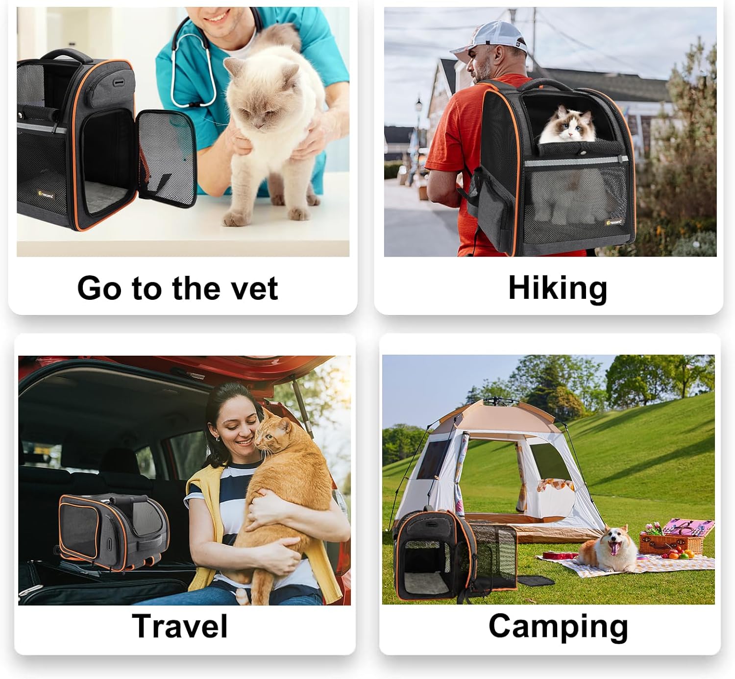 【Superior Ventilation and Visibility】This cat backpack for carrying cats features breathable mesh windows on three sides, allowing ample airflow and easy observation of your pet as they enjoy the surrounding scenery. The expanded back panel serves as a giant tent bed for your furry friends to enjoy outdoor time with nature and sunshine, without feeling stuffiness in the cat bag. Experience the best ventilation ever.