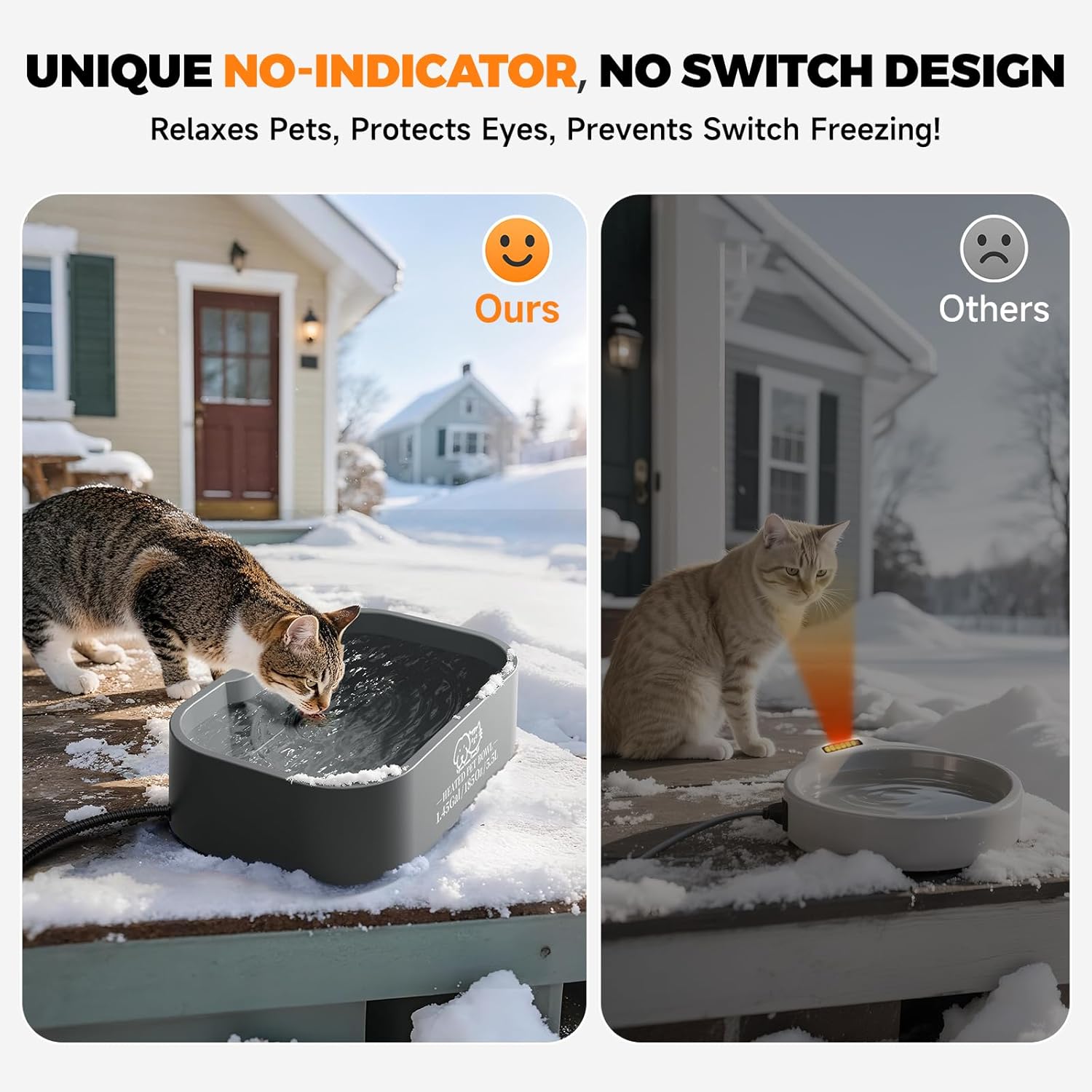 🐾【Unique No-Indicator Design for Pet Comfort & Fully Safety Certified】Our heated water dish is designed without indicator lights to keep your furry friends calm and relaxed, avoiding the distraction or eye strain caused by glowing lights.The no-switch design also prevents pets from accidentally turning off the bowl and stops the switch from freezing in cold weather.A built-in thermostat automatically turns the heat on and off for safe operation.This bowl has passed CE, FCC, and UL safety certifications.