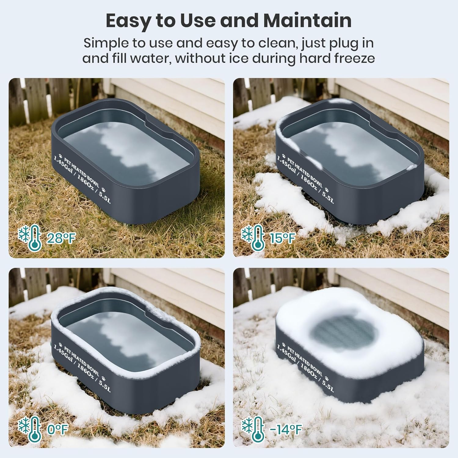 【Built for Safety – BPA-Free, Anti-Chew & Waterproof Power Cord】Your pet’s safety comes first. This heated pet bowl is made from heavy-duty, BPA-free, non-toxic materials that are safe for pets and durable enough for outdoor use. Features a 200cm (6.6 ft) reinforced, waterproof, anti-chew power cord to resist biting and wear — giving you peace of mind even with curious chewers. Designed to last, season after season.