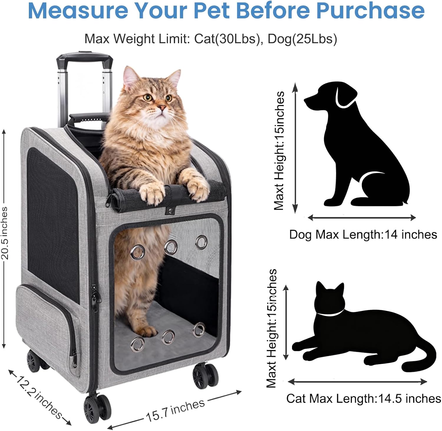 【Measure Your Pet Before Purchase】: Recommended for 1 large cat up to 30 lbs, 2 small to medium cats, or 1 small dog up to 25 lbs. Weight alone may not determine fit—please measure your pet’s height and body length and refer to the size chart in the main images. This large rolling pet carrier backpack is not airline-approved but perfect for car travel, vet visits, and daily use.