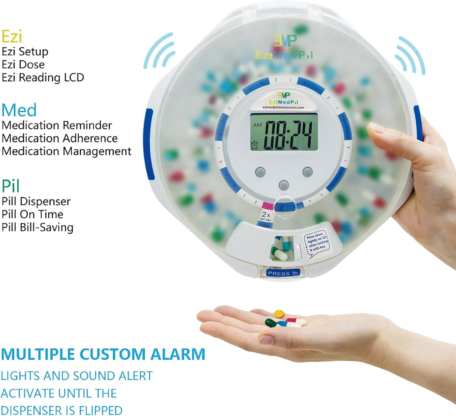 [MEDICATION ADHERENCE MANAGEMENT–NEVER MISS OR DOUBLE DOSE] The Locked Automatic Pill Dispenser Lets Patients & Caregivers Program Dosages Up to a Maximum of 28 Consecutive Days w/ Audio & Visual Alerts 1X to 6X Daily | Allows RIGHT Patients to take RIGHT Dose & RIGHT Medications at RIGHT Time | Significantly Improving Medication Adherence Management | No Monthly Charge.