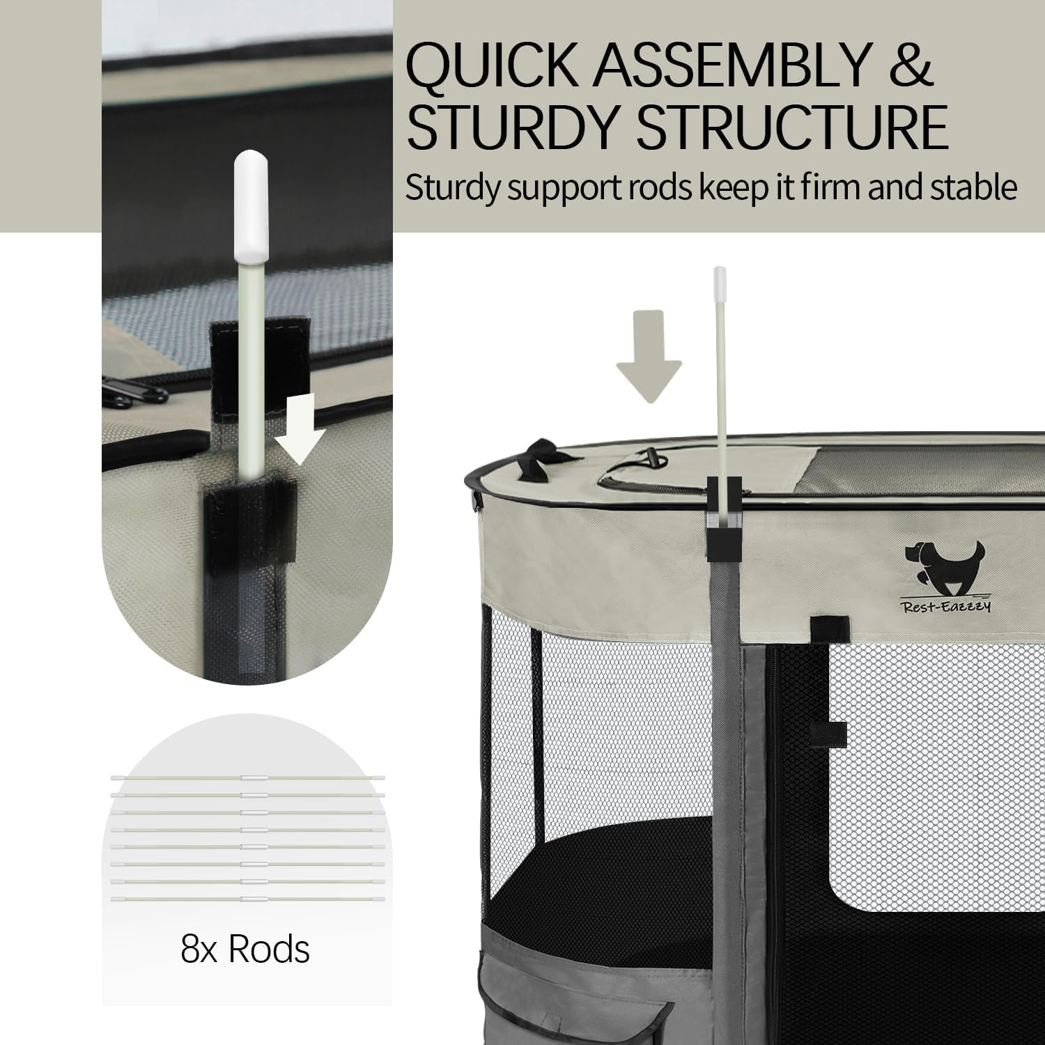 Ultra-Portable & Instant Setup: Just insert 8 strong support rods in the space slot of the dog crates for medium dogs, and the top is equipped with a handle for easy movement. Sets up in 30 seconds without tools – perfect for traveling, camping, or backyard adventures. When not in use, it can be folded into the handbag we provide for easy carrying and storage.