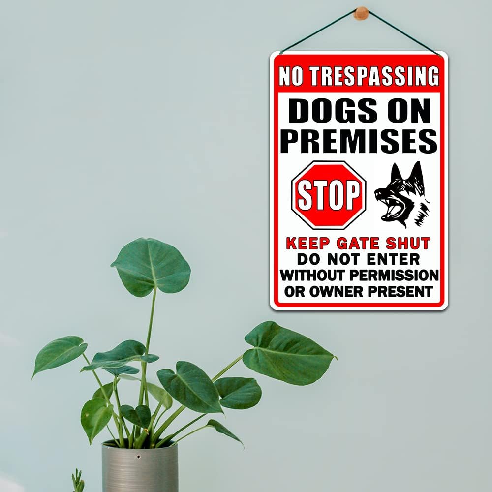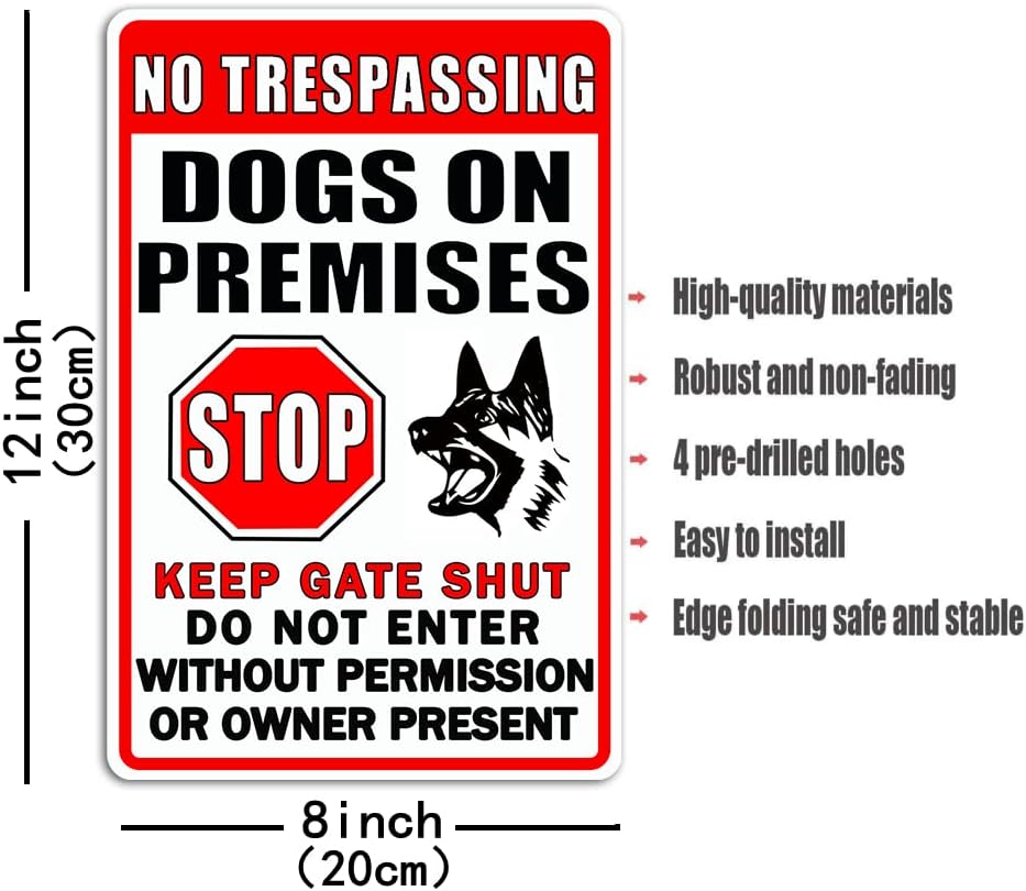 Interesting theme of warning signs : This metal tin sign with interesting theme patterns, It says, No Trespassing, Dog on Premises, Stop, Keep gate Shut do not Enter Without Permission or Owner Present, will be a great highlight, especially suitable for yard garden decoration, adding fun and color to your life lives.