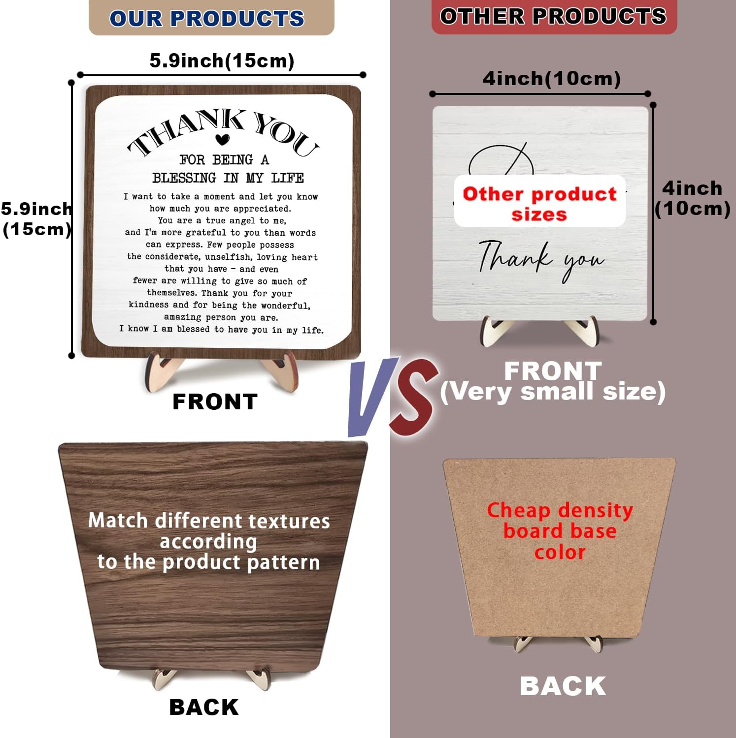 The wooden plaque measures 5.9×5.9×0.32Inches. The base is retro wooden stand, and the plaque is made of natural wood, which has no odor and is not easy to deform and fade