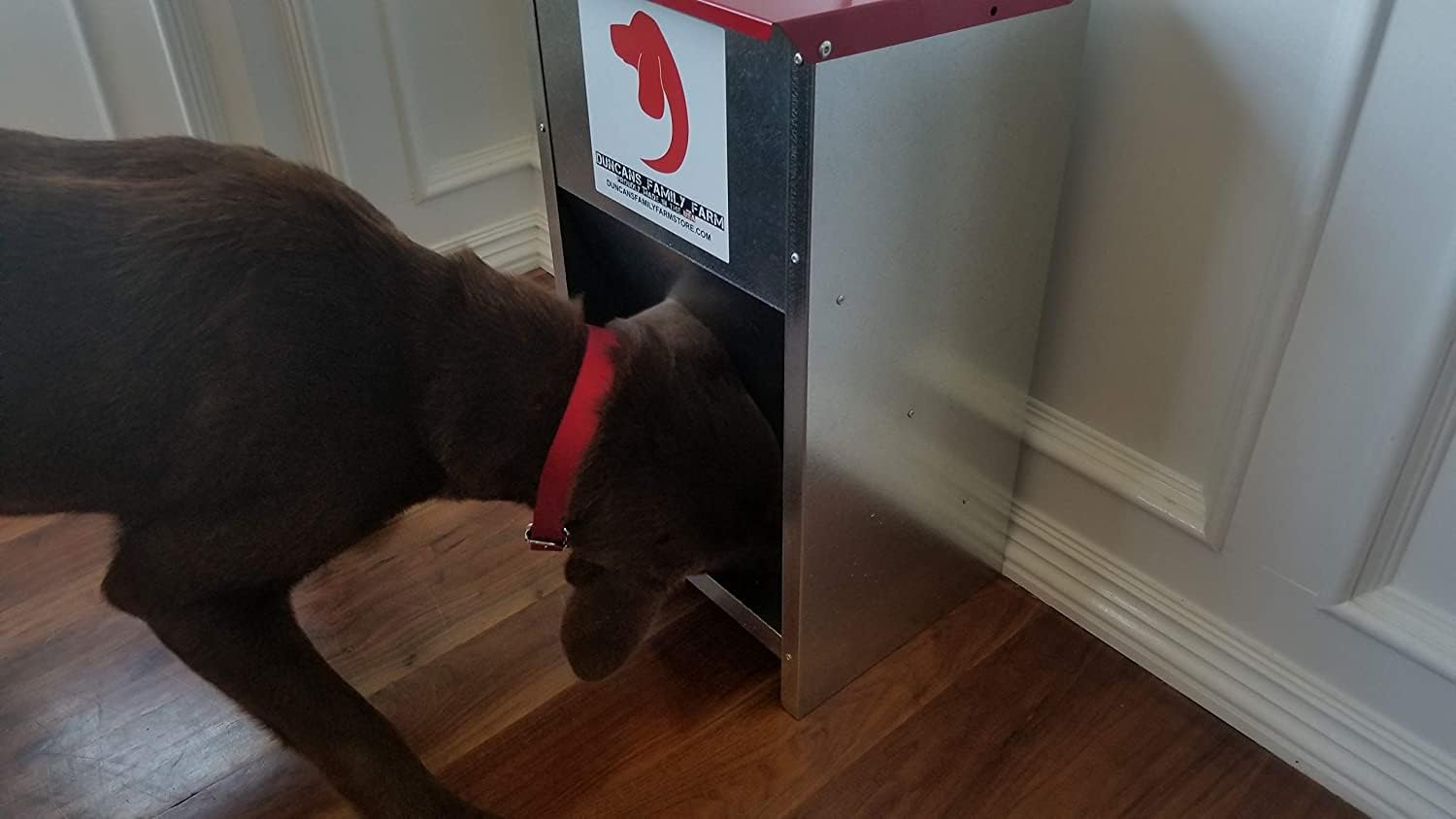 Fresh, easy to dispense kibble with no timers, no frequent refills, no complicated settings, and no fuss. Duncan’s Dog Feeders use a simple gravity feeding system. Your dog pushes down the door on the bottom and the wedge shape distributes the pet food. Dogs who have never used dispensers might need you to push the door for them for a few days or you can leave the door propped open until they figure it out. Simple quality engineering that’s made to last from Duncan’s Family Farm Store.