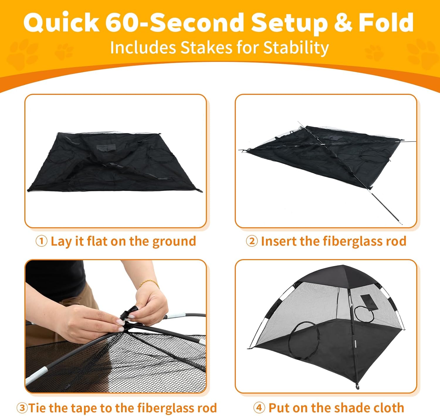 Easy Setup – Unfold with poles, secure stakes & done! No tools required – even kids can do it. Ideal for camping, beaches, or backyard adventures with your beloved pets