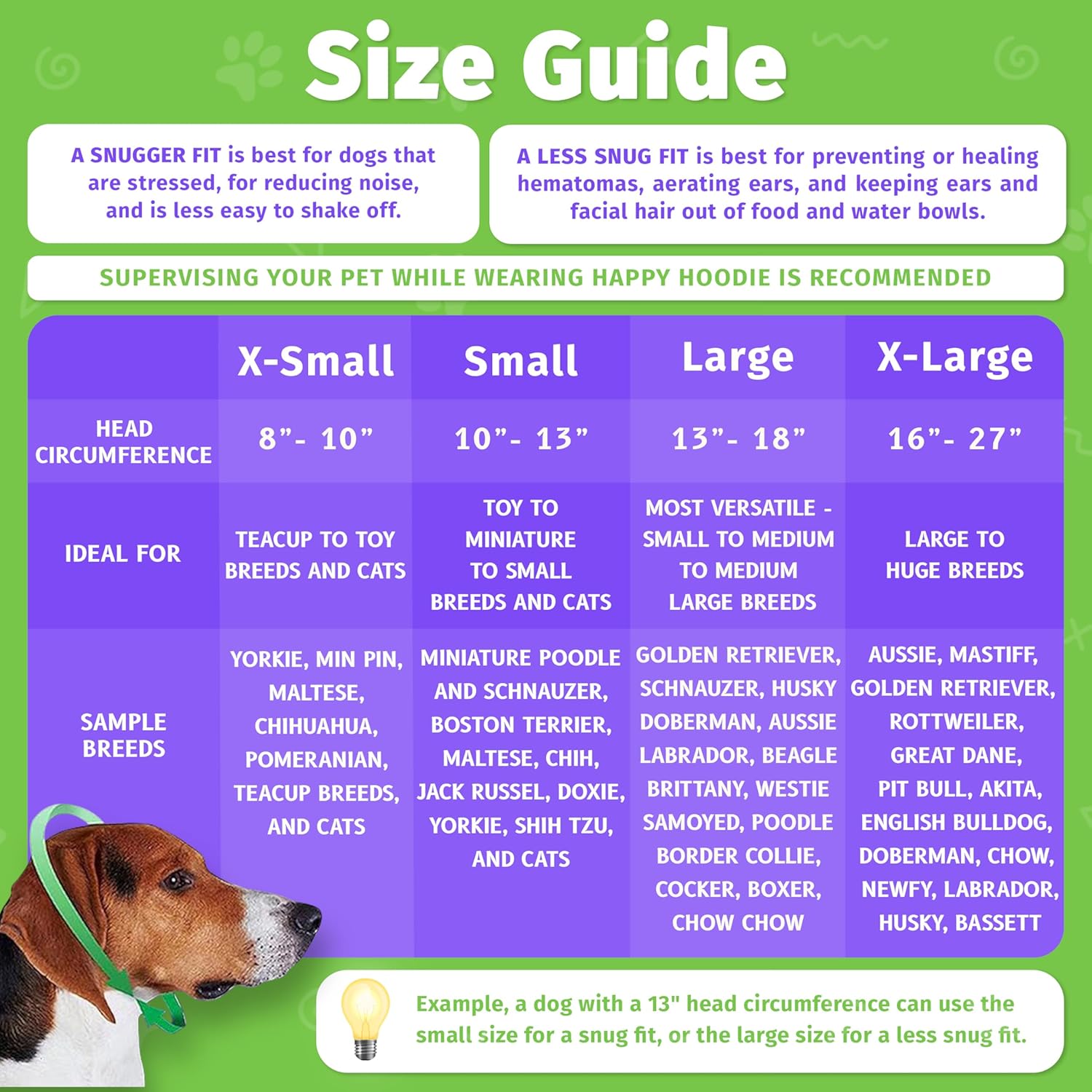𝗛𝗢𝗪 𝗧𝗢 𝗥𝗘𝗗𝗨𝗖𝗘 𝗡𝗢𝗜𝗦𝗘. It is important to place the ears DOWN over the ear canals so the ear canals are NOT exposed, then secure them in place w/ Happy Hoodie. Noise reduction is achieved by Happy Hoodie’s gentle compression closing off the ear canal. IF YOU THINK IT’S TOO TIGHT, PLEASE KNOW SNUGNESS IS NECESSARY. IF YOUR 4 FINGERS FIT UNDER IT, IT’S NOT TOO TIGHT (IT’S SO STRETCHY!). Pets appreciate it most when used ONLY during a stressful situation. PLEASE REFER TO SIZE GUIDE BEFORE PURCHASE.