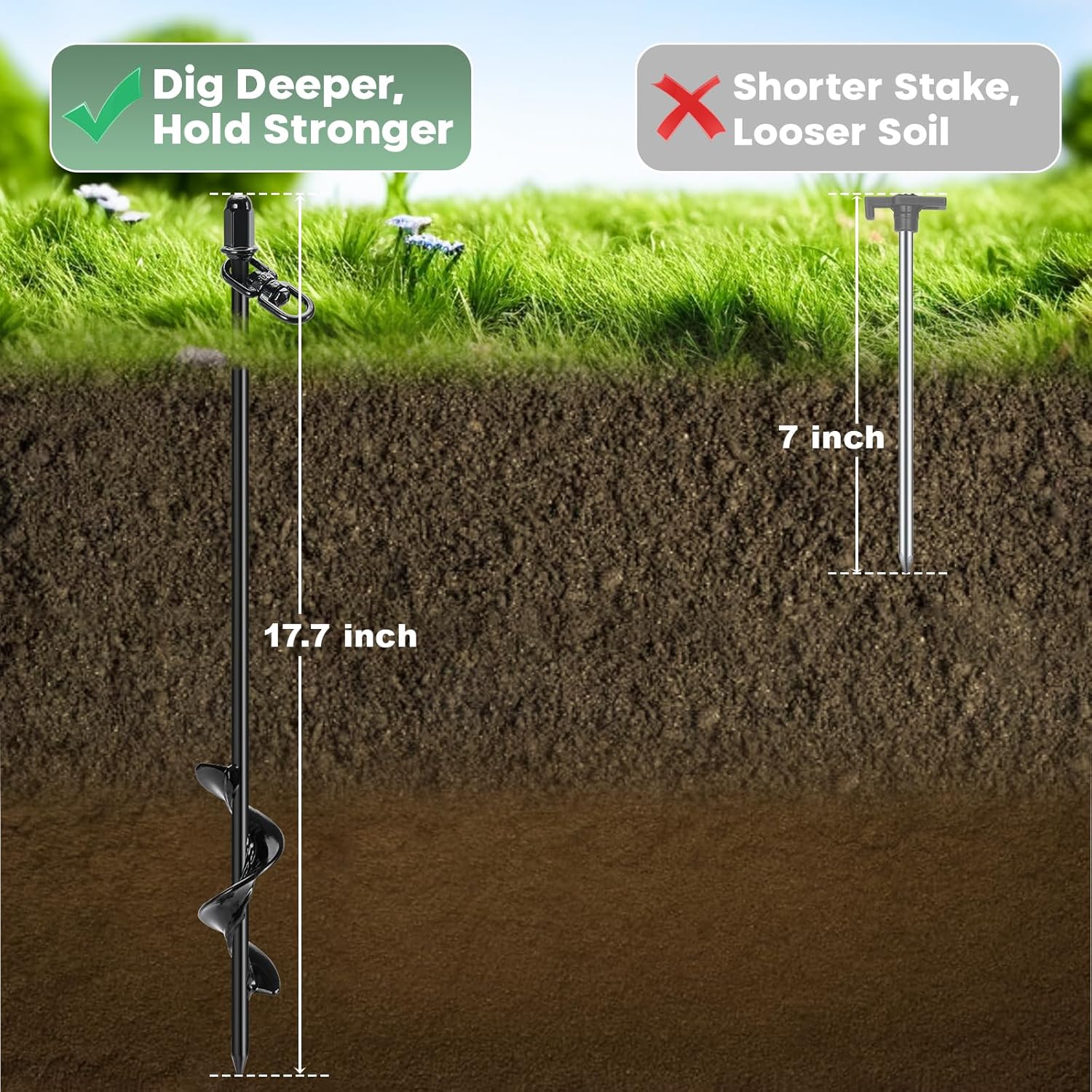 17.7 Inch Tent Stakes: 1.5″ helix blades design bites into clay, grass, typical soil—longer shafts = deeper hold. (Best in soft-to-medium ground; hard pack/gravel may need extra support)