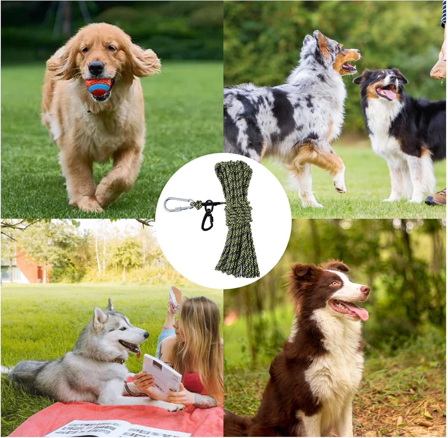 PREMIUM QUALITY MATERIAL: The yard dog leash is made of reflective rope and heavy duty steel buckles for durability. Our ultra-lightweight 360° anti-tangle leashes and carabiners keep your pup safe while playing in the open yard.