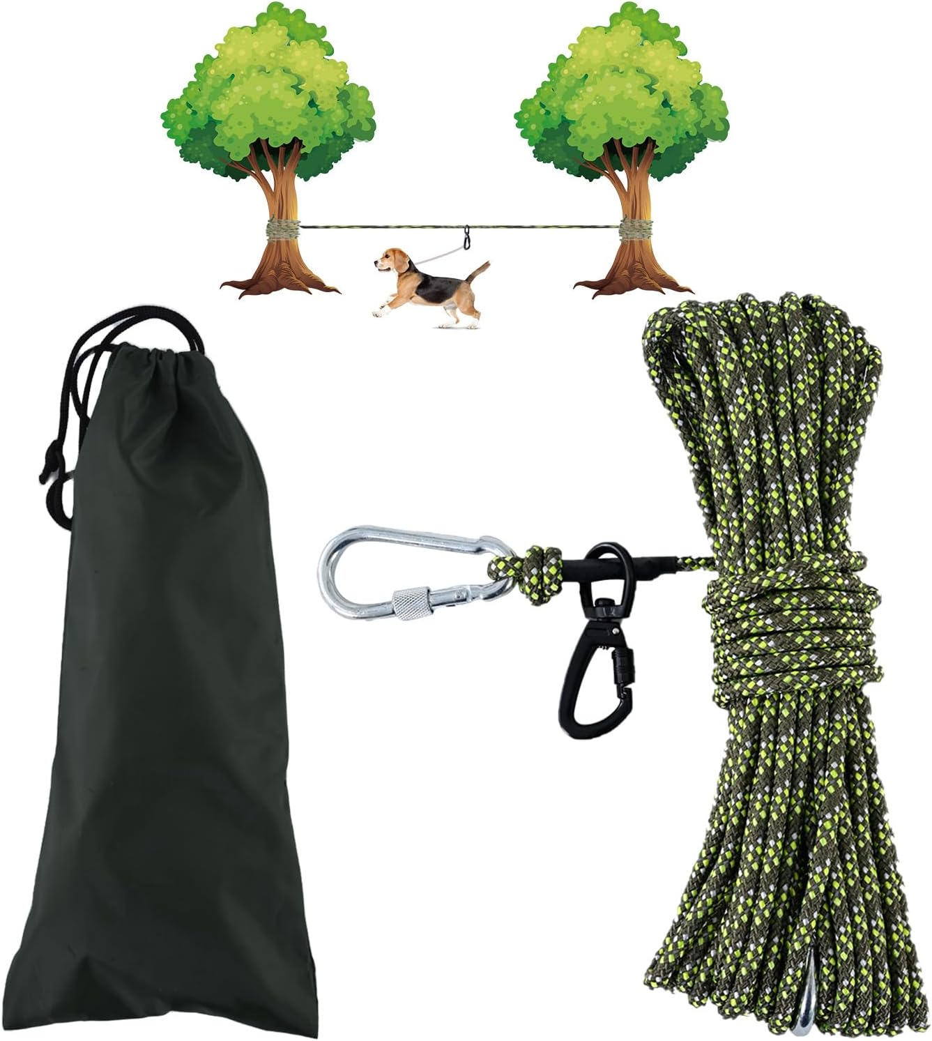 PREMIUM QUALITY MATERIAL: The yard dog leash is made of reflective rope and heavy duty steel buckles for durability. Our ultra-lightweight 360° anti-tangle leashes and carabiners keep your pup safe while playing in the open yard.