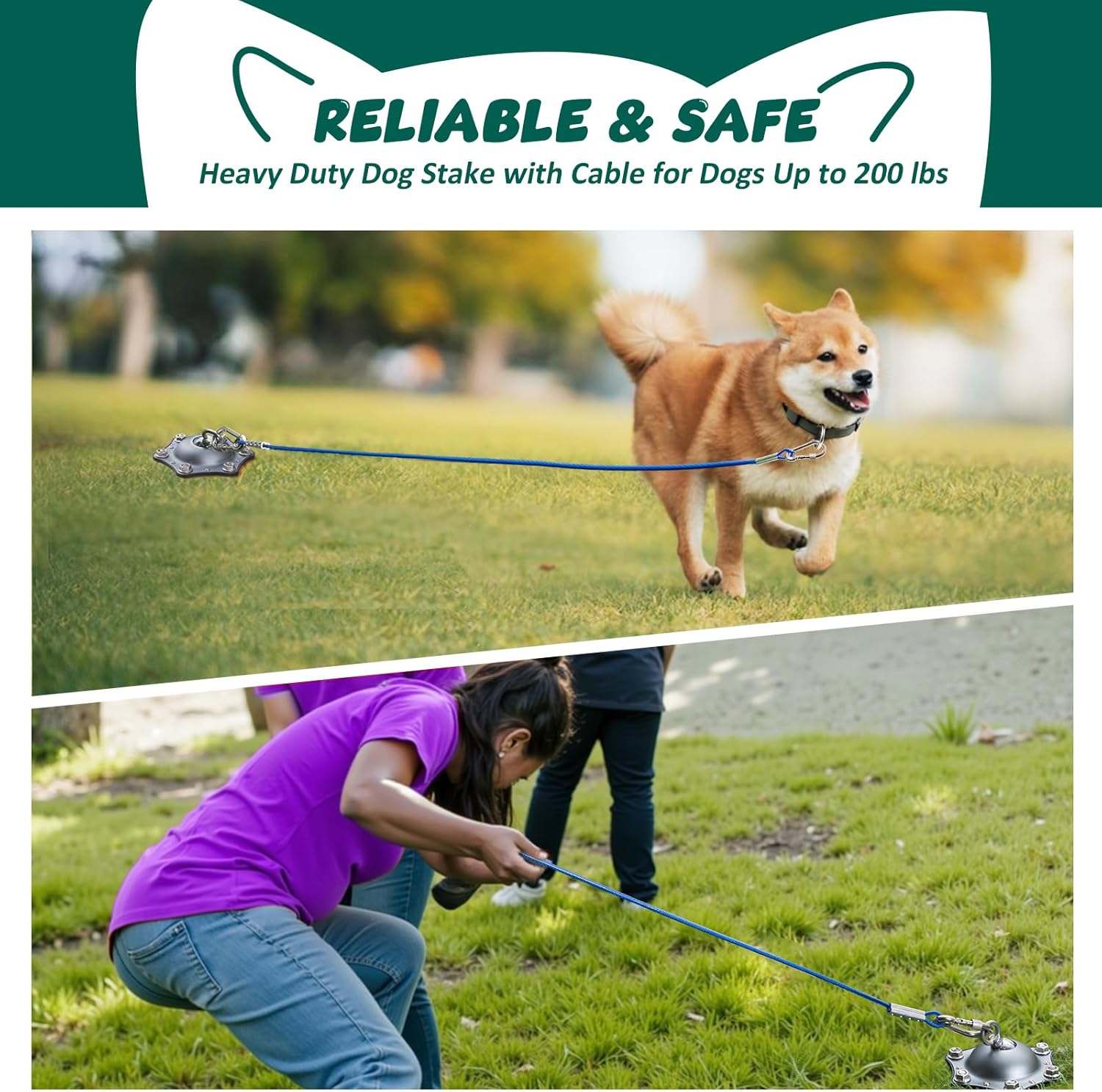 💝【Reliable & Sturdy】Dog stake is made of aluminum alloy and 304 stainless steel, sturdy reliable and rust proof, can stand up to 200 lbs. When installing the 6 included 10-inch long screws ground anchor stakes, securely hold 1000 lbs in stable ground. Play freely and safely without a fence or barrier system, perfect for yard, lawn, camping, outside