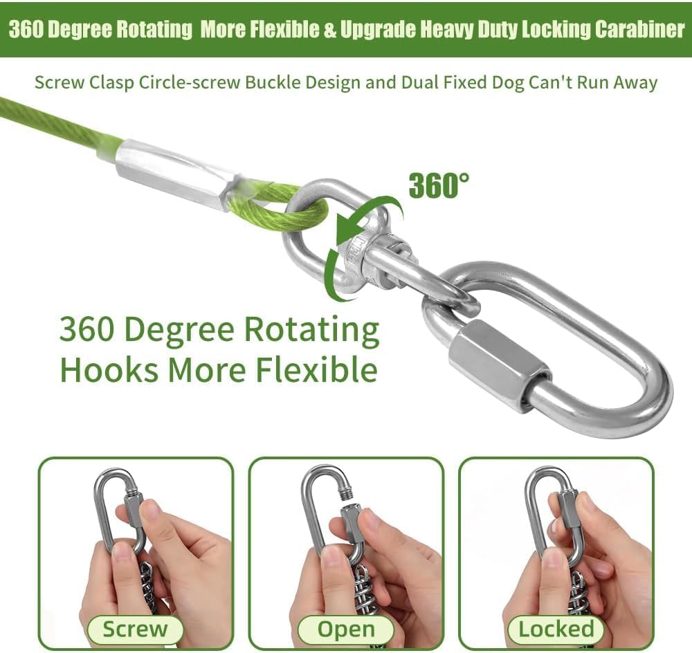 Ultra Strong Dog Tie Out Cable–The inner core of our dog tie out rope is consits 7*19 stainless steel wire with chew proof PVC coating which is the most tightly twisted and most durable structure of dog cable,Our dog tie out have been professionally tested for tensile and quality,providing superior strength and durability against breakage,Good corrosion resistance, will be reliable to use,it’s perfect for dogs up to 300LBS.