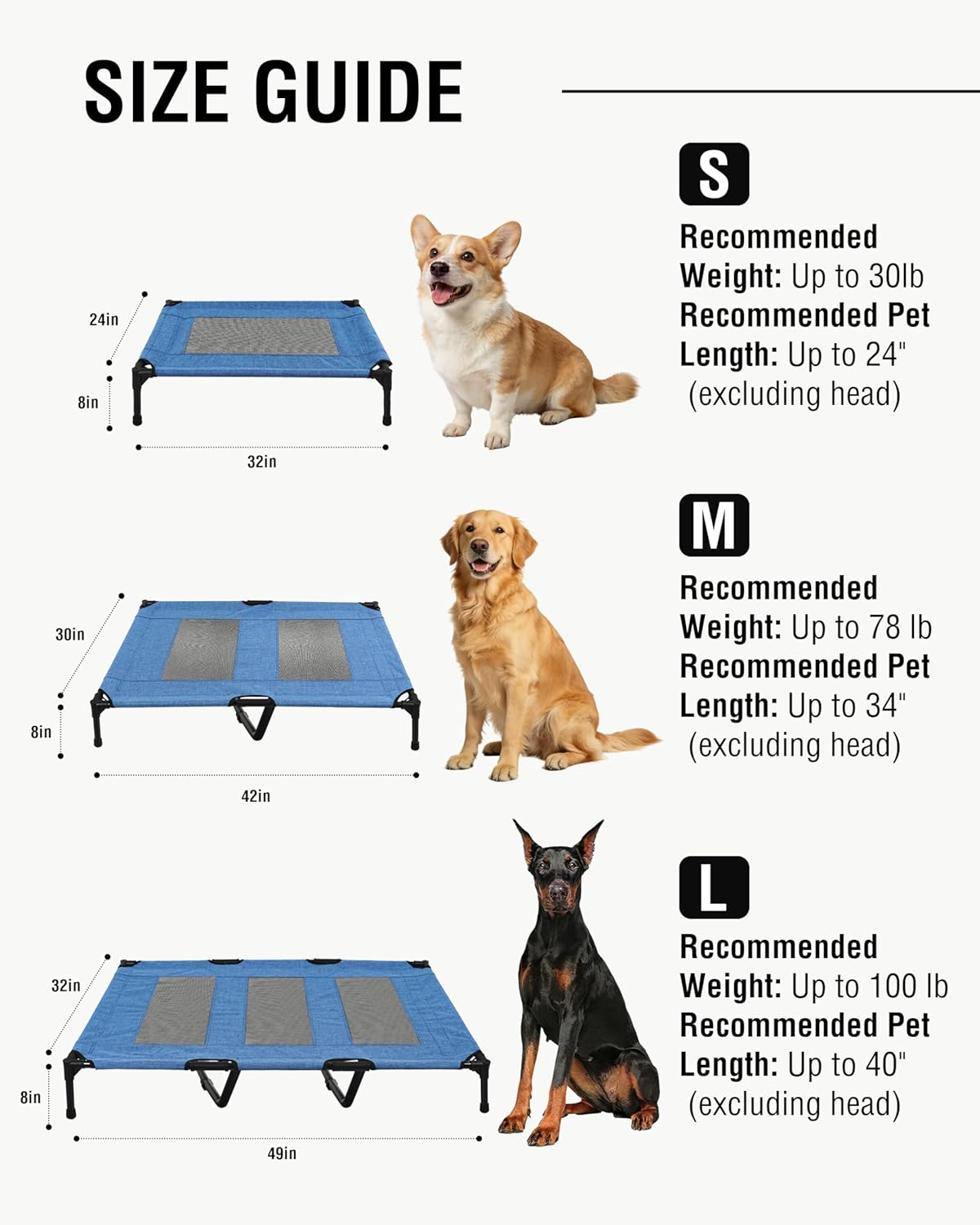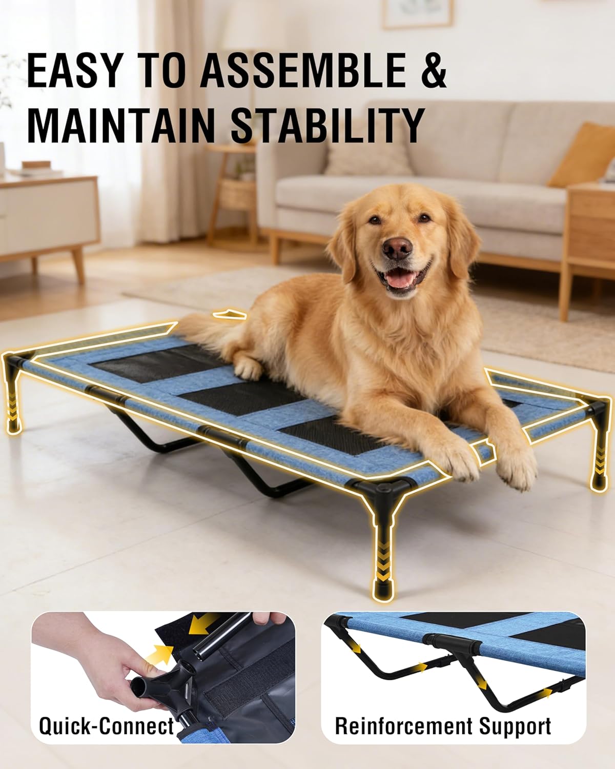 STURDY & SECURE SUPPORT;Built with a reinforced steel frame, this elevated dog bed stays stable without wobbling or tipping—even restless sleeper can settle down here.In addition, the L-size dog bed equipped with 2 additional U-shaped support steel pipes and heavy-duty frames to provide more reliable support, giving your dog feel secure, relaxed, and comfortable every day