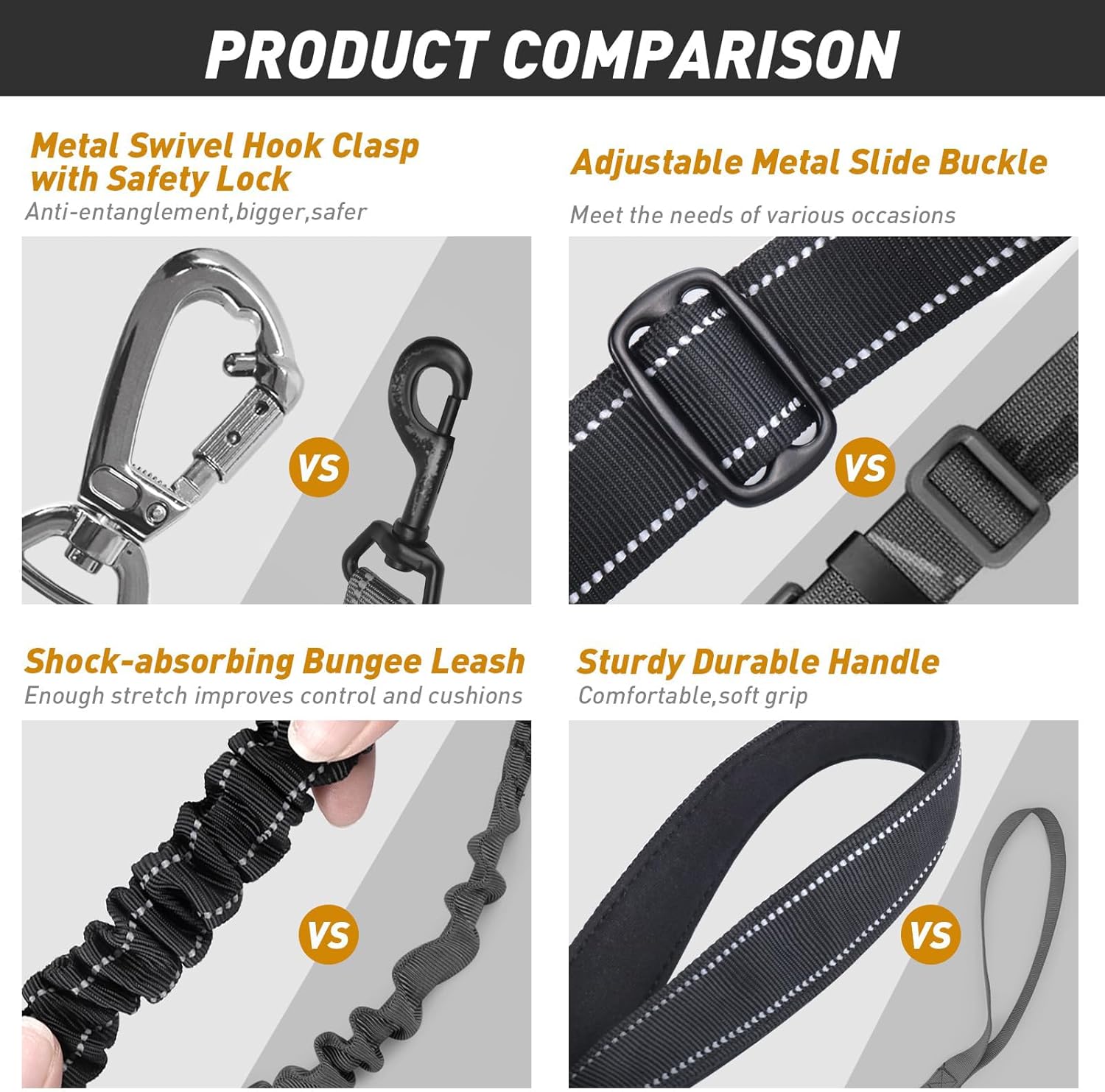 Shock Absorbing Bungee Dog Leash – This strong dog leash uses innovative Zero Shock BUNGEE Technology perfect for controlling and cushioning the pulling, which makes dogs’ walking enjoyable! if your dog is a strong puller, you need an indestructible anti-shock leash, 4 ft to 6 ft.