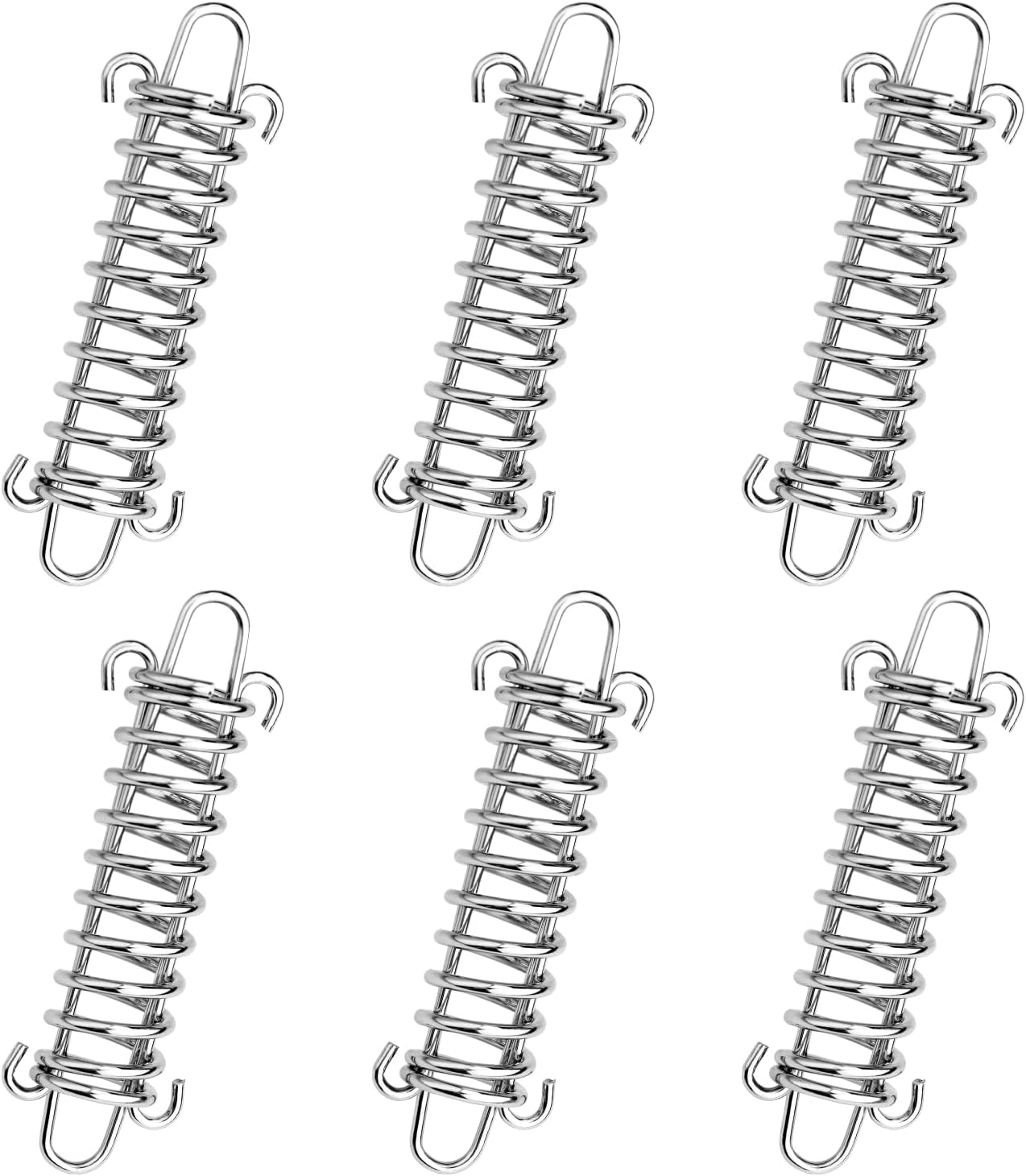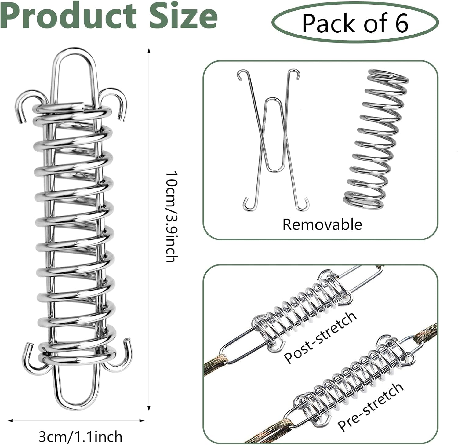 Self-Adjusting Design: The tent tension springs with double hooks have high toughness and high elasticity, which can effectively tighten and stretch, so that the tent rope is always in a taut state. The tent spring buckle can buffer the wind and prevent the tent from being damaged by the wind.