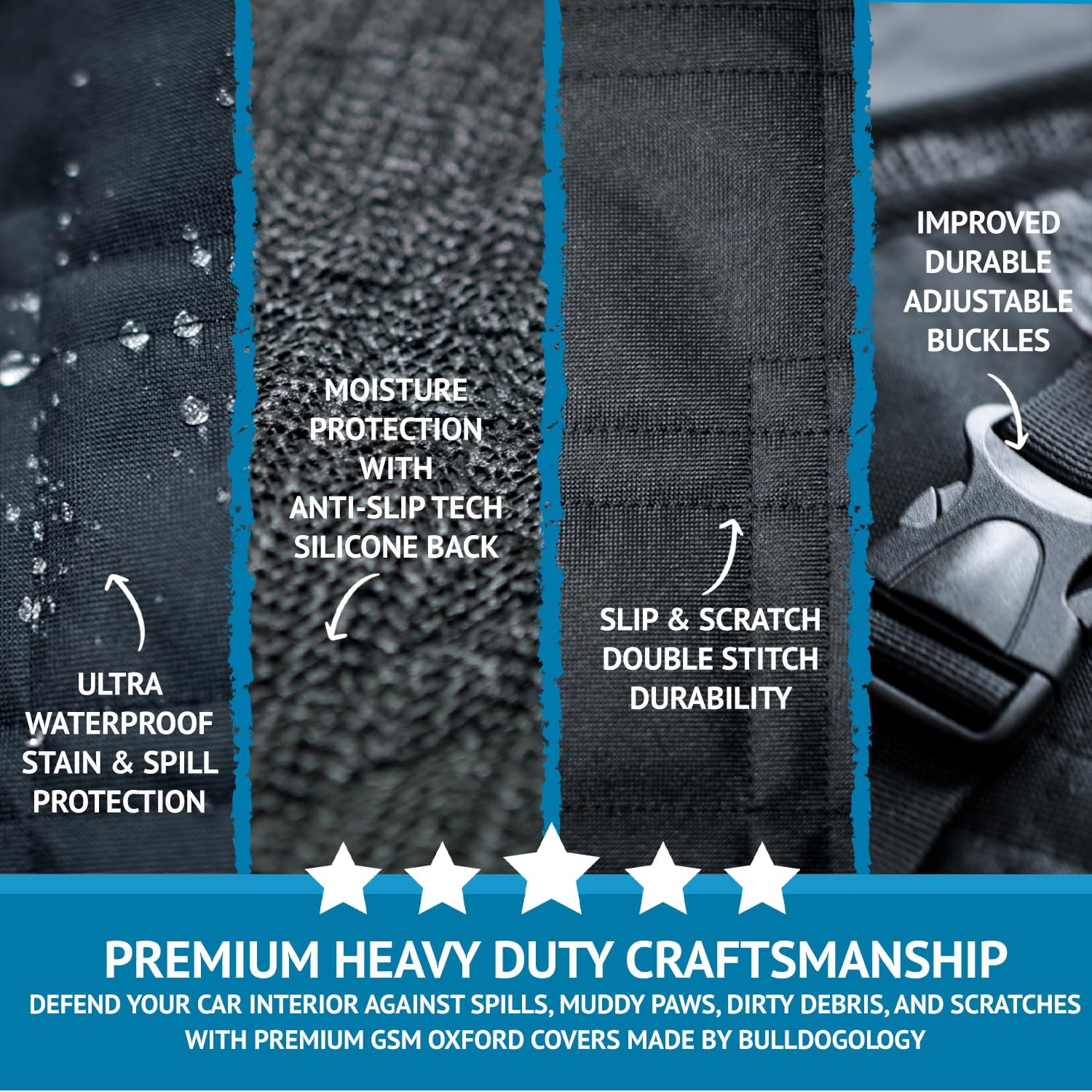 Trunk Cover Protector: Defend your cargo and trunk area against dog hair, muddy paws, dirty debris, spills, stains, scratches, groceries, heavy equipment, beach sand, and other unwanted accidents. Bulldogology cargo liner for SUV includes full side protectors, zippers, mesh window, 60/40 option, and extra thick layers for all-around protection. Regardless of what your pet may put it through, our dog car seat covers are crafted with premium 600D GSM Oxford Material that Guarantees Satisfaction