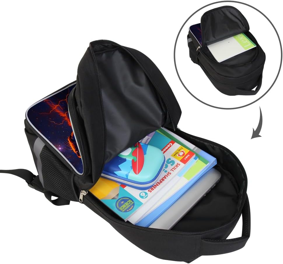 PERFECT SIZE FOR BOYS BACKPACK:This bookbag for boys measures approximately 12.2*6.7*17.3 in;One main compartment, front pocket, two side pockets. Roomy to fit laptop, iPad, text books, lunch box, pencil case, water cups, umbrellas etc.Fit your kids’daily essential needs