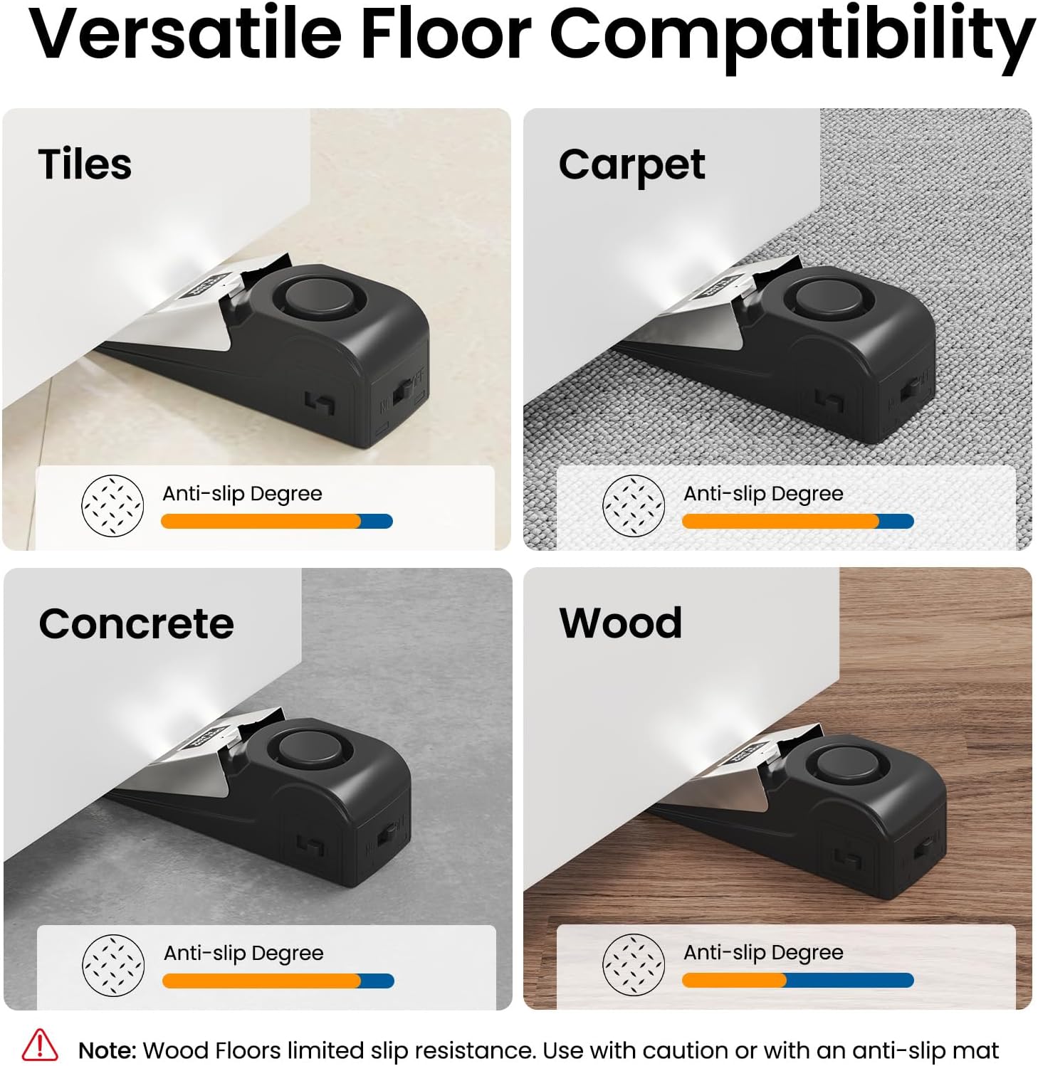 Dual-Function Door Stopper: The door wedge alarm also functions as a door stopper; when the alarm is off, it operates as a silent, non-slip wedge that firmly holds the door open, its anti-slip design prevents unintended door movement, providing enhanced security and safety