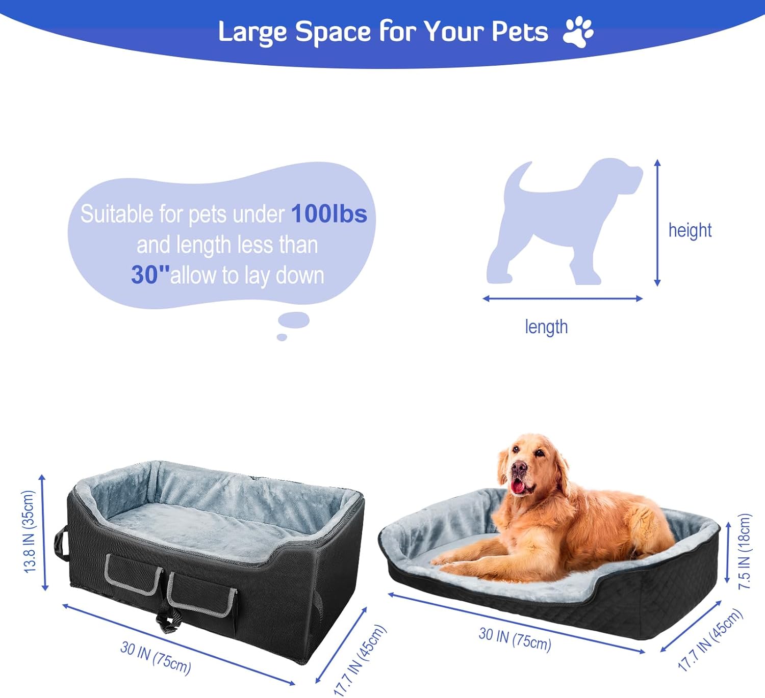 【Large Space for Your Dog】The INFANZIA dog booster car seat for large dogs has dimensions of 30” L x 17” W x 13” H, making this doggy car booster perfect for large-sized dogs weighing 55 pounds or less, and also fits up to 2 Medium dogs. Before purchasing, please measure your puppy to find the most suitable seat size.