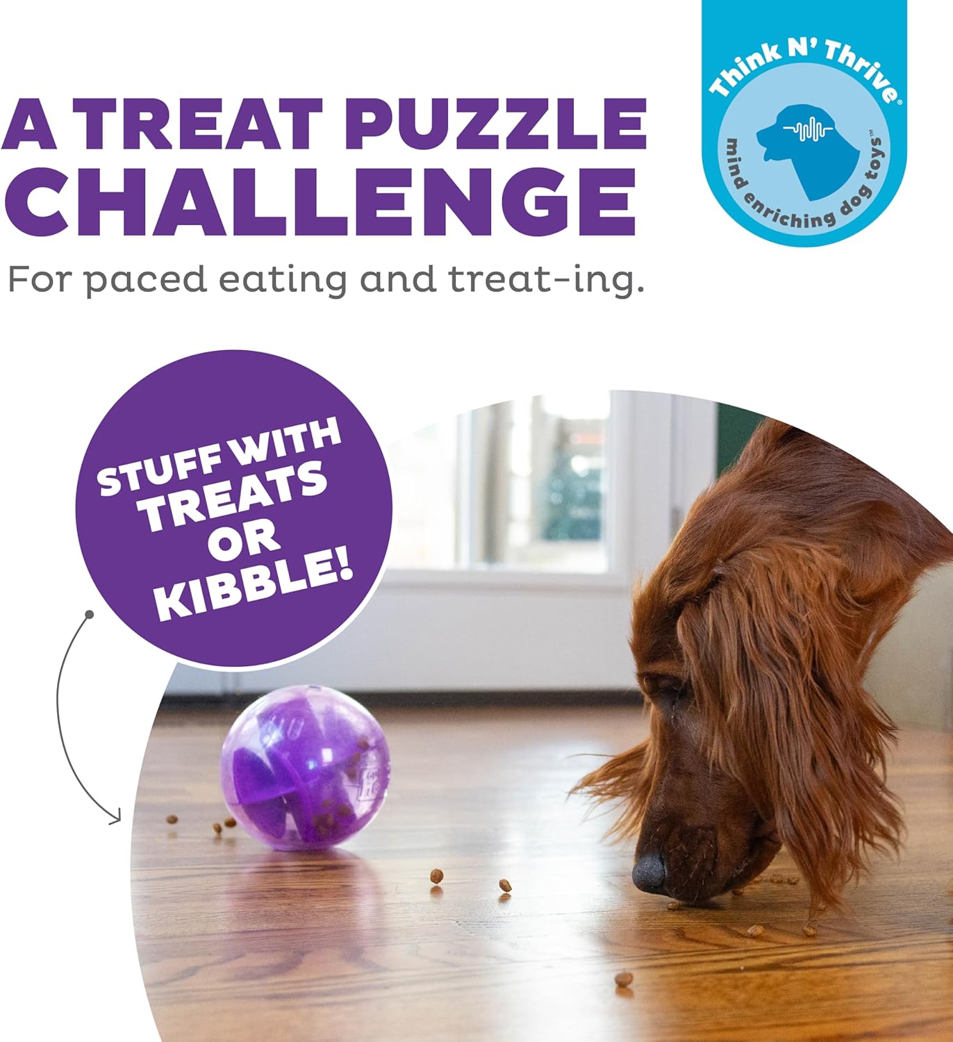Slow feeder for dogs; great for pups who gobble up their treats too fast, this toy is designed to make it easy to see and sniff out treats while dispensing them at a slower pace that’s better for digestion. Note: the size of the treats or kibble determines the flow – smaller pieces release more at once and come out faster.