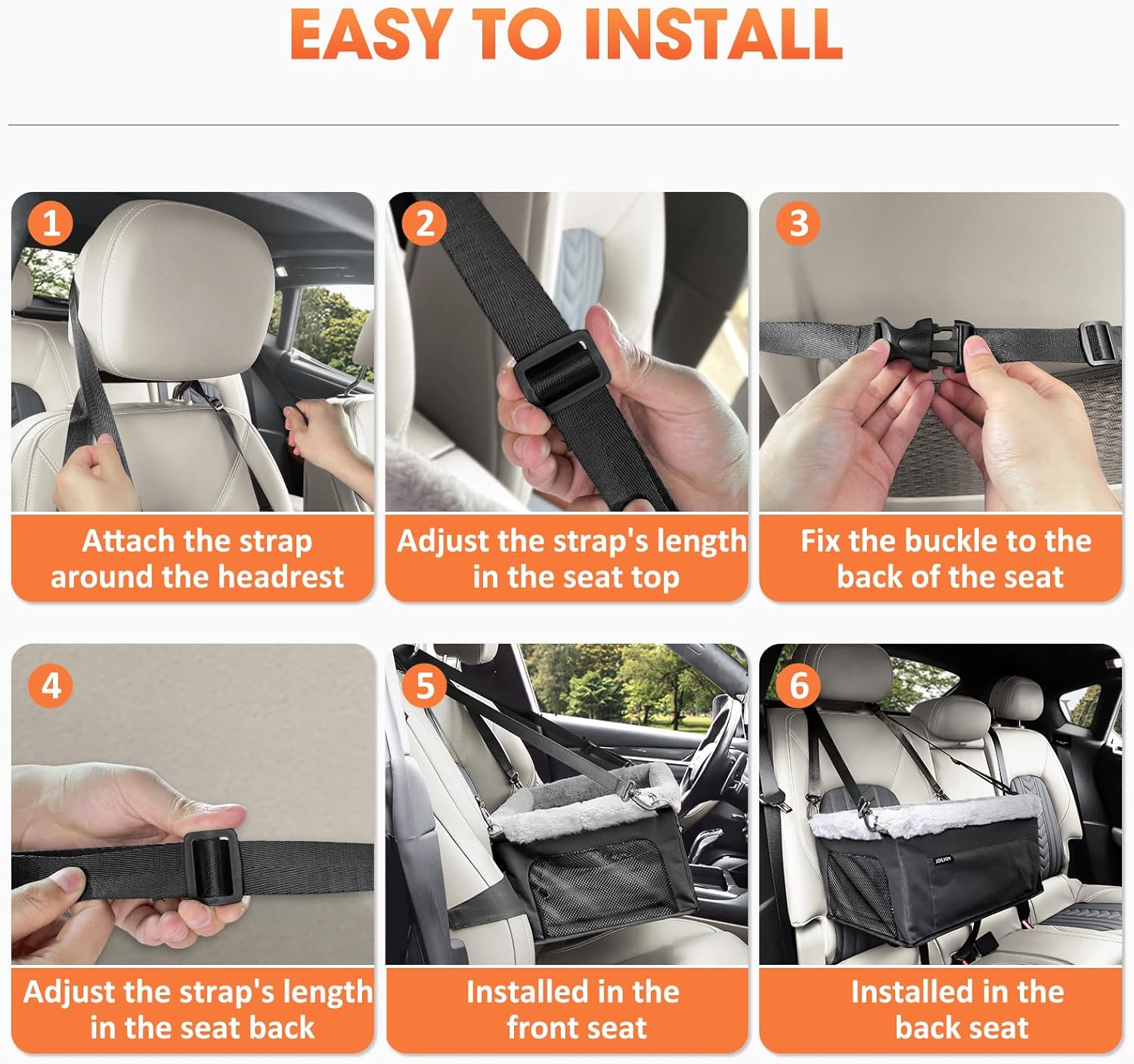 🐶[Easy to Install]: With its adjustable buckle design, the car seat for dogs can be easily installed. Simply attach the two straps around the headrest, fix the buckle to the back of the seat, and adjust the strap length as needed. It can be installed in both the front and back seats of your car, and it is compatible with most types of car seats and car models.
