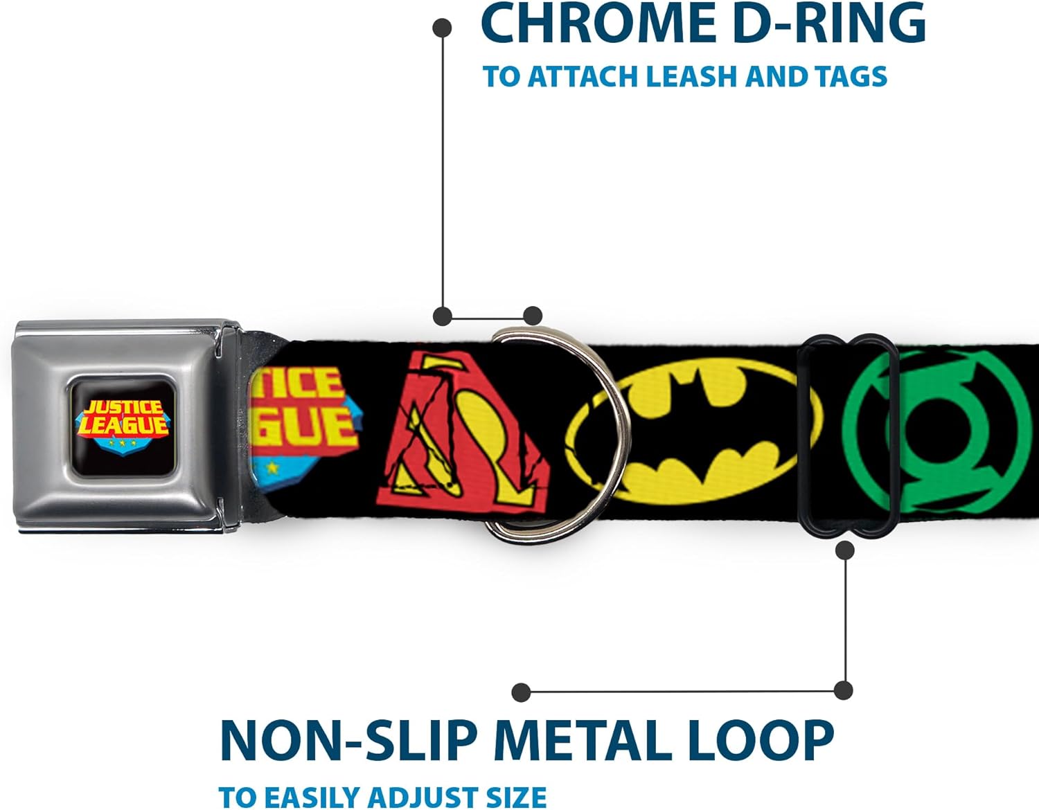Buckle-Down Seatbelt Buckle Dog Collar – Justice League Superhero Logos CLOSE-UP Black – 1″ Wide – Fits 15-26″ Neck – Large