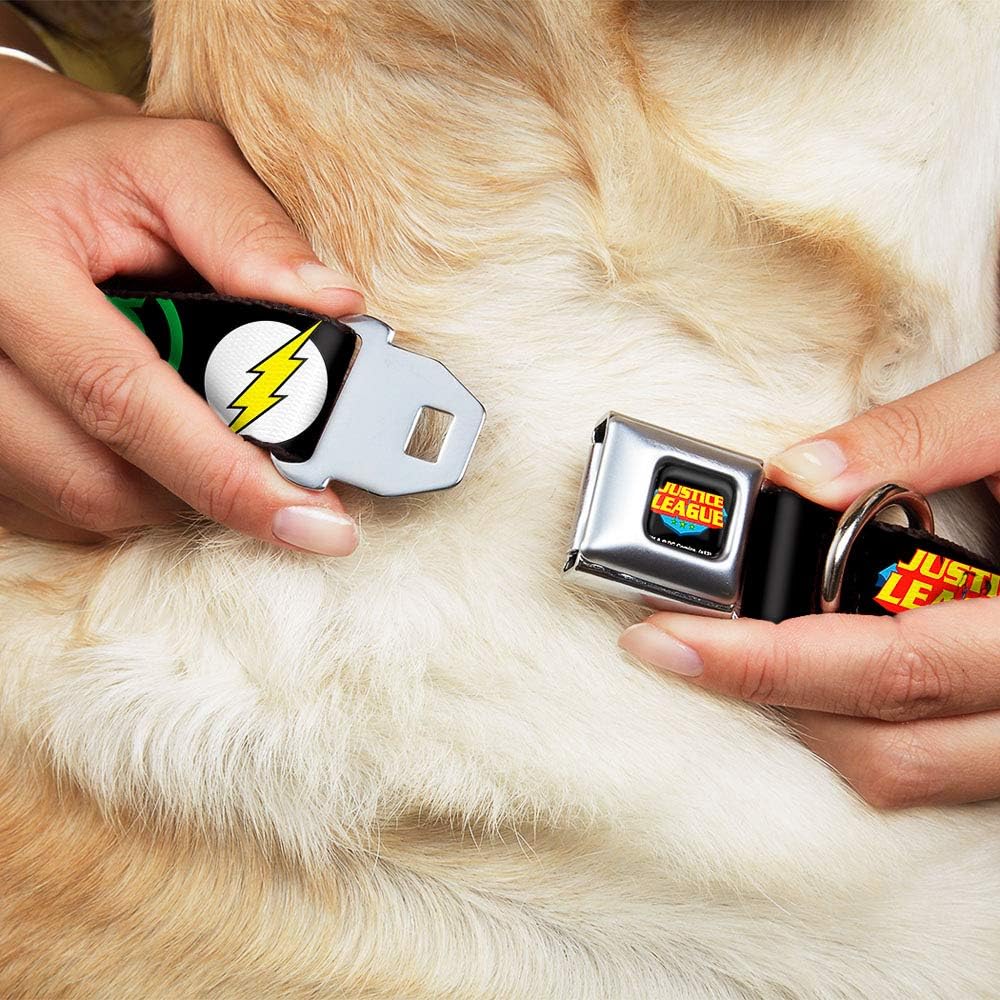 Buckle-Down Seatbelt Buckle Dog Collar – Justice League Superhero Logos CLOSE-UP Black – 1″ Wide – Fits 15-26″ Neck – Large