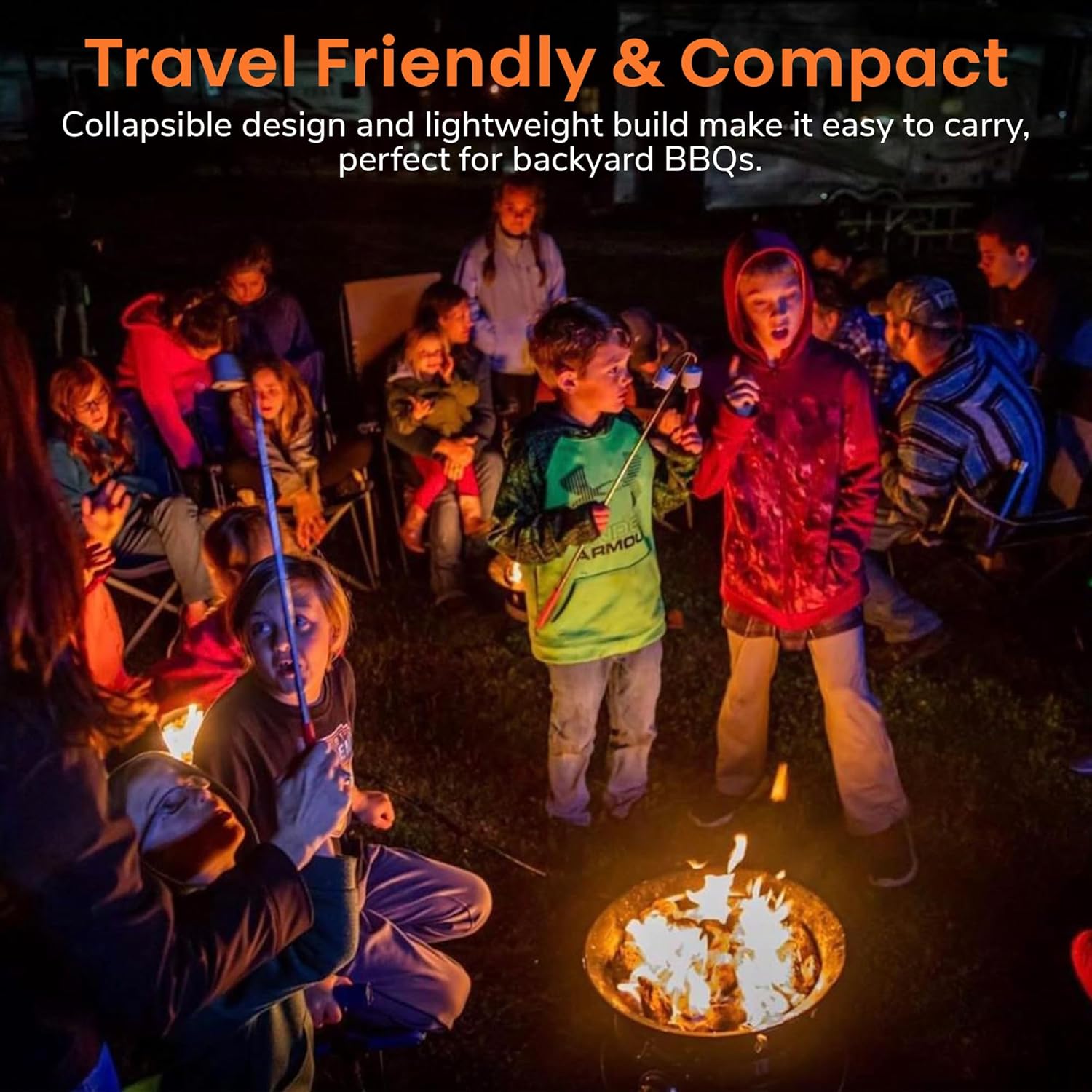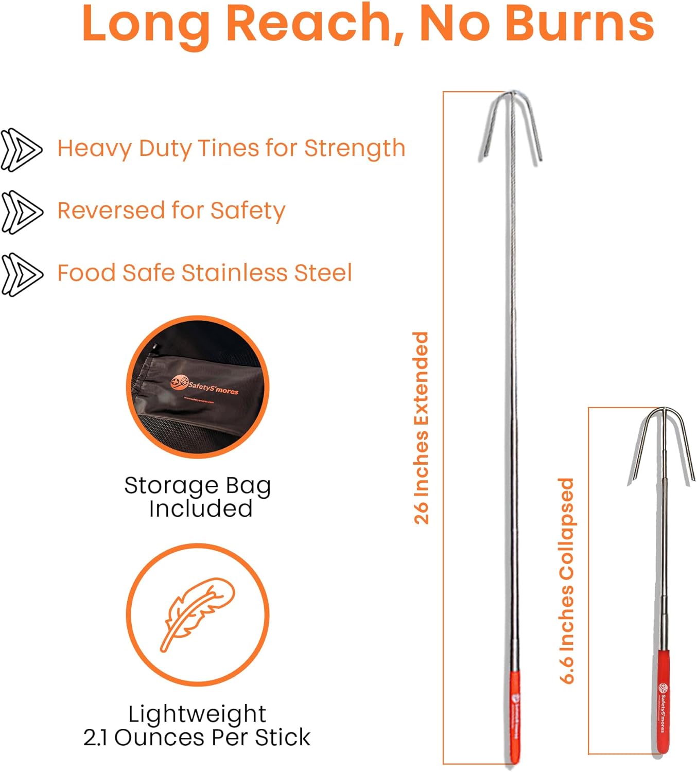 TELESCOPING STICKS – Keep everybody a safe distance from the fire and collapse for easy storage.