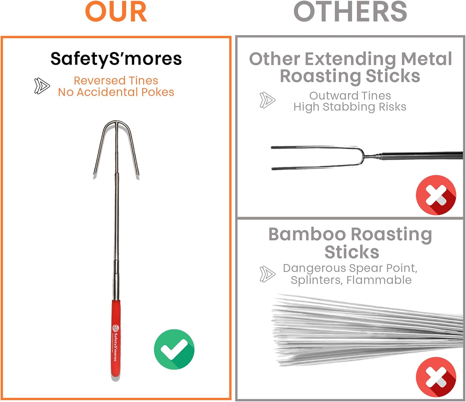 SAFER ROASTING – Unique reversed prongs keep kids safe from accidental stabbing from the camp fire sticks.