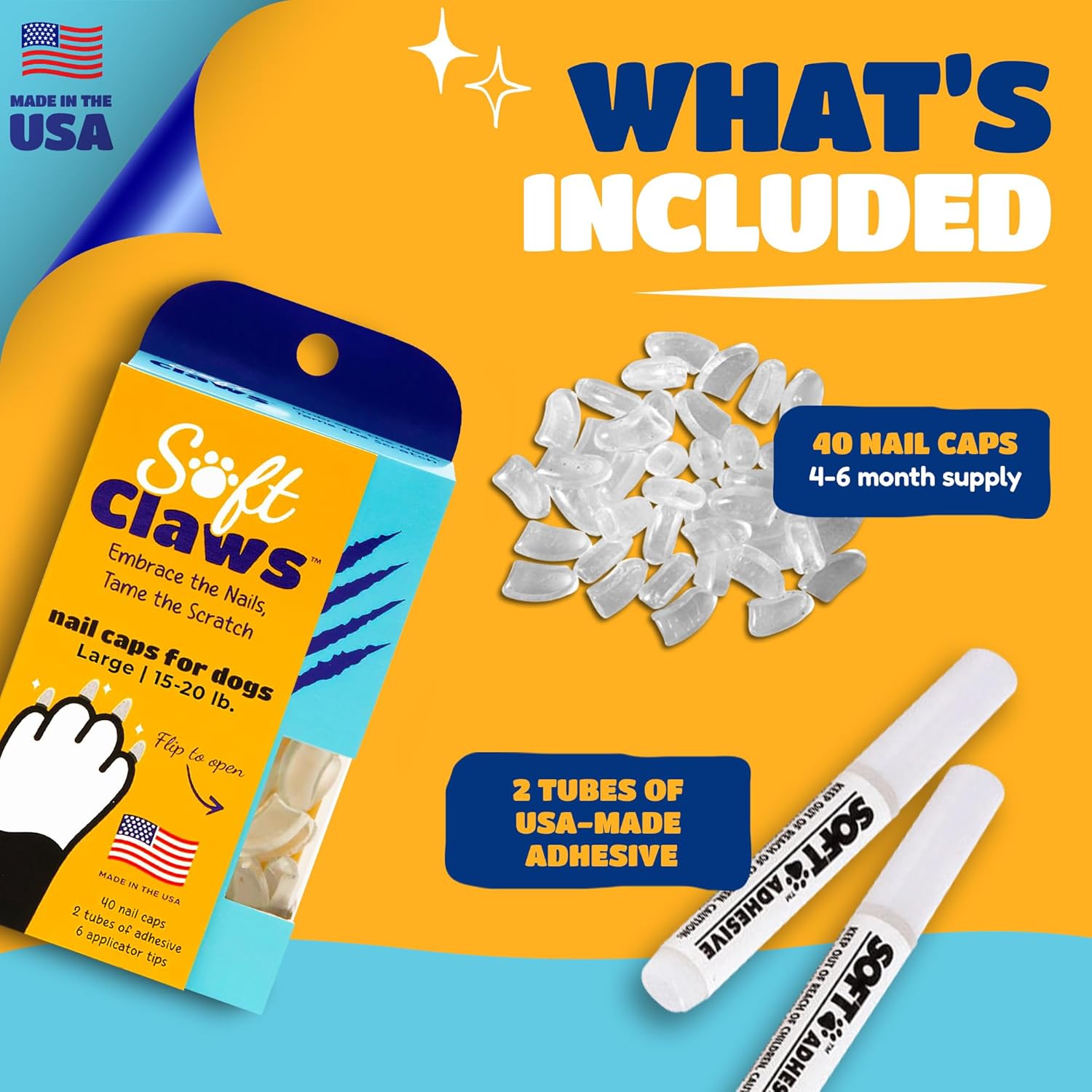 THE ORIGINAL, USA-MADE NAIL CAP: Soft Claws started it all! Invented by a veterinarian and manufactured in the USA, these nail caps provide grip support to help dogs regain their footing on slippery surfaces. Crafted from durable vinyl and safe adhesive—both made in the USA—these pet-friendly dog nail covers reduce scratching-related injuries and protect sensitive skin.
