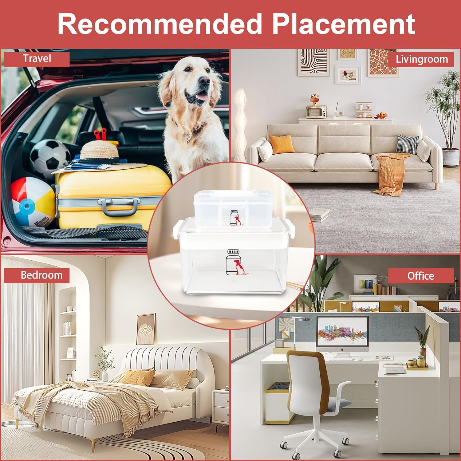 【Large capacity】-The first aid kit set ideal for storing scattered drugs, thermometer, cotton bud, bandages, ointments, wipes, swabs, tweezers, and more. Neat and clear, easy to find. The large one can be placed the big bottle and is big enough to store various specifications drugs.The small one can be classify your pills with the 3 compartments dividers. This medicine box divider is removable.