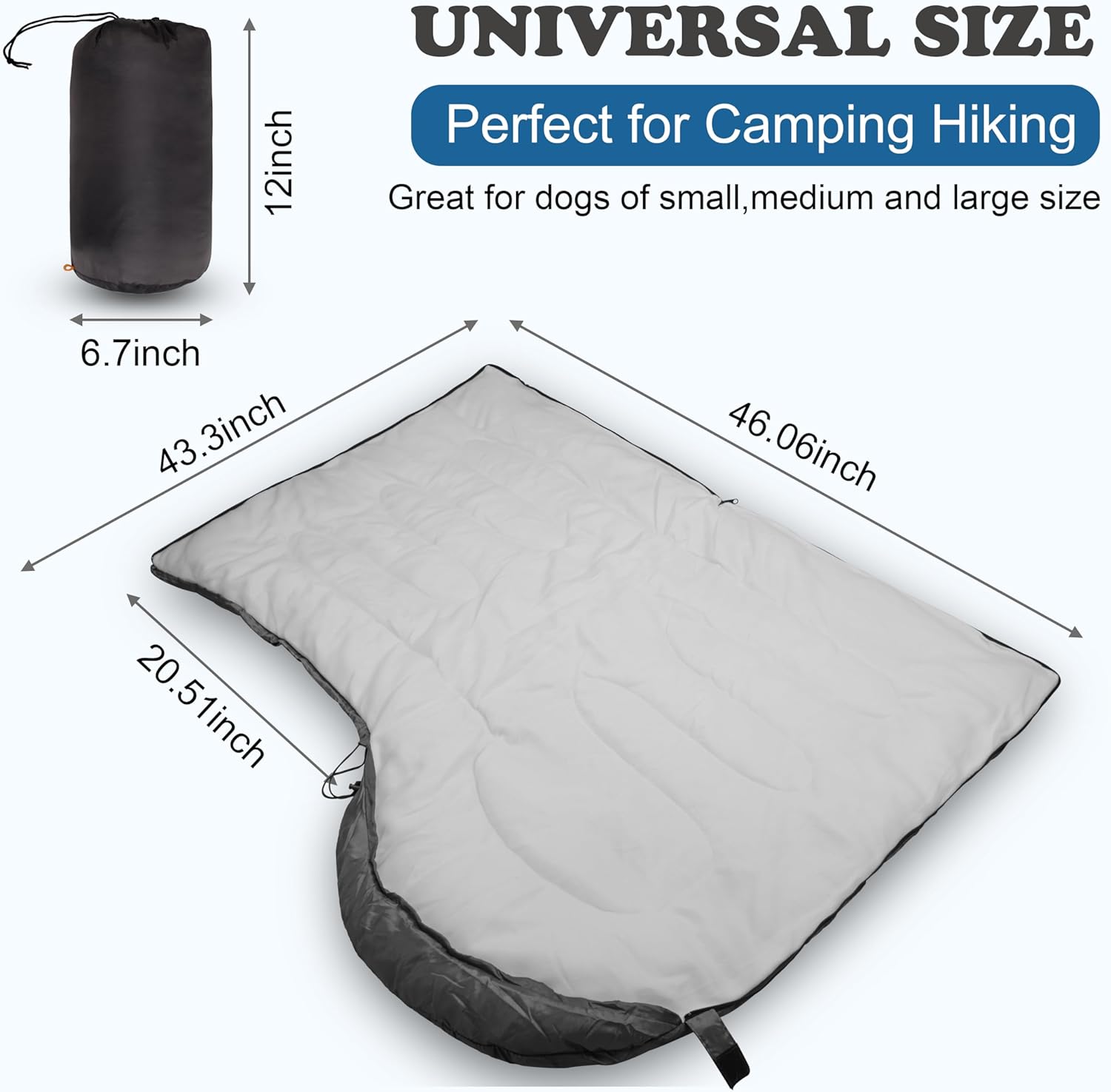 Dimension: 43.3″Lx27.5″W. Perfect for medium and large dogs. The width can be up to 58″ when you open its side zipper. Also a soft bed mat cushion at homes and backyards!Comfortable Material: The dog bed bag is made of polyester outer with soft fleece inner, provides enough warmth while dog sleeping on cold surfaces. The waterproof material ensures they’ll stay dry on wet ground.Portable: The dog bed mat comes with a travel-friendly carry bag, you can roll it up when not use, easy to carry and store.great for backpacking or camping hiking.Safe Design: The dog bed has zipper on the bottom and one side of the bag, and drawstring design on the head. Easy operation and also keep dog protected.Package Include:1 x Dog sleeping bag + 1 x Storage bag
