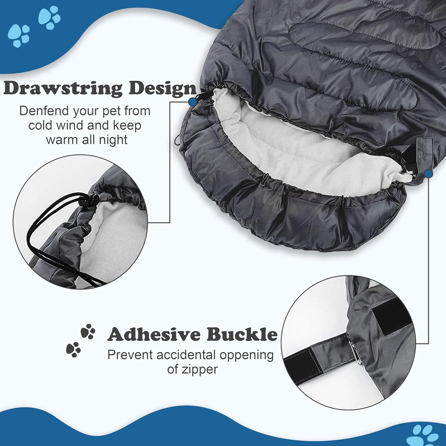 With drawstring design on the head keeps your dog stay in the sleeping bag all the night.